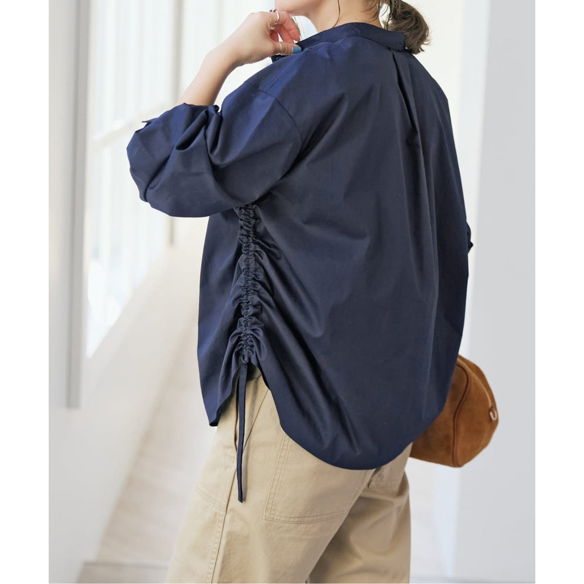 サイドのドロストデザインでウエストのシルエットを自在に調整でき、さりげなく印象を変えられるのがポイントです。