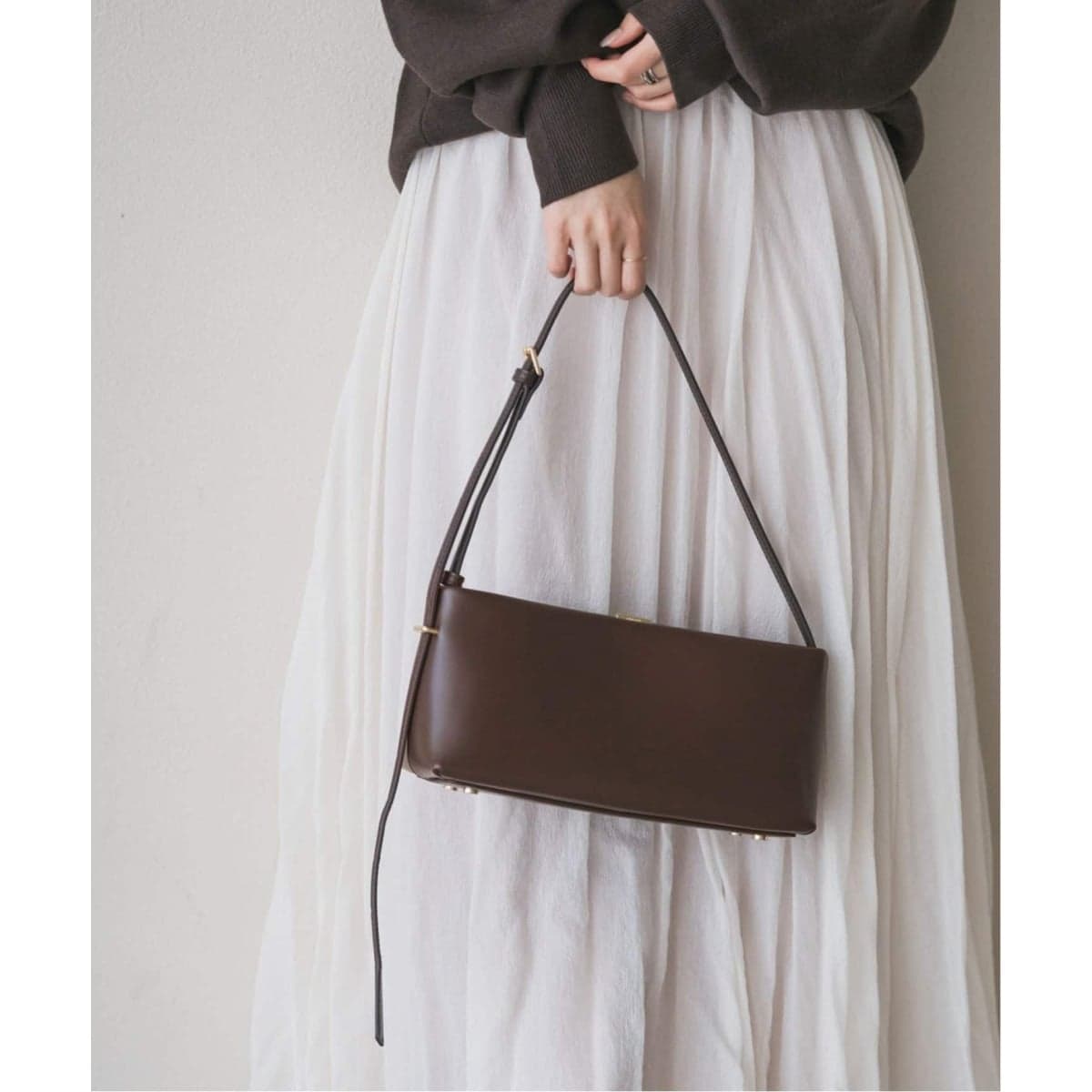 口元の留め金具がさりげなくも高級感を高めてくれる横長フォルムのワンハンドルバッグ。