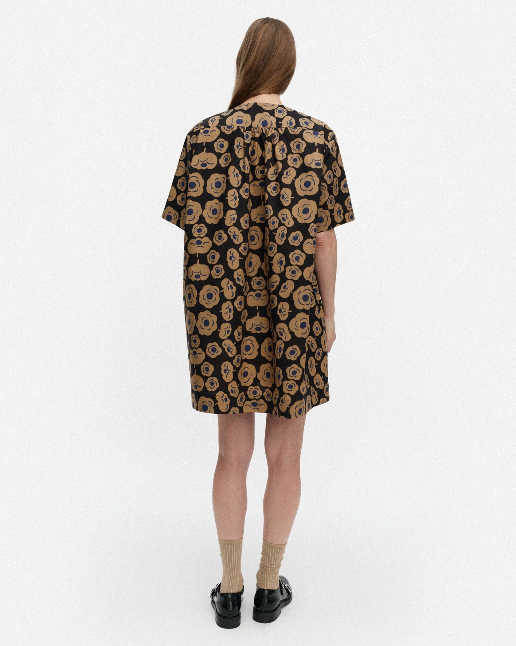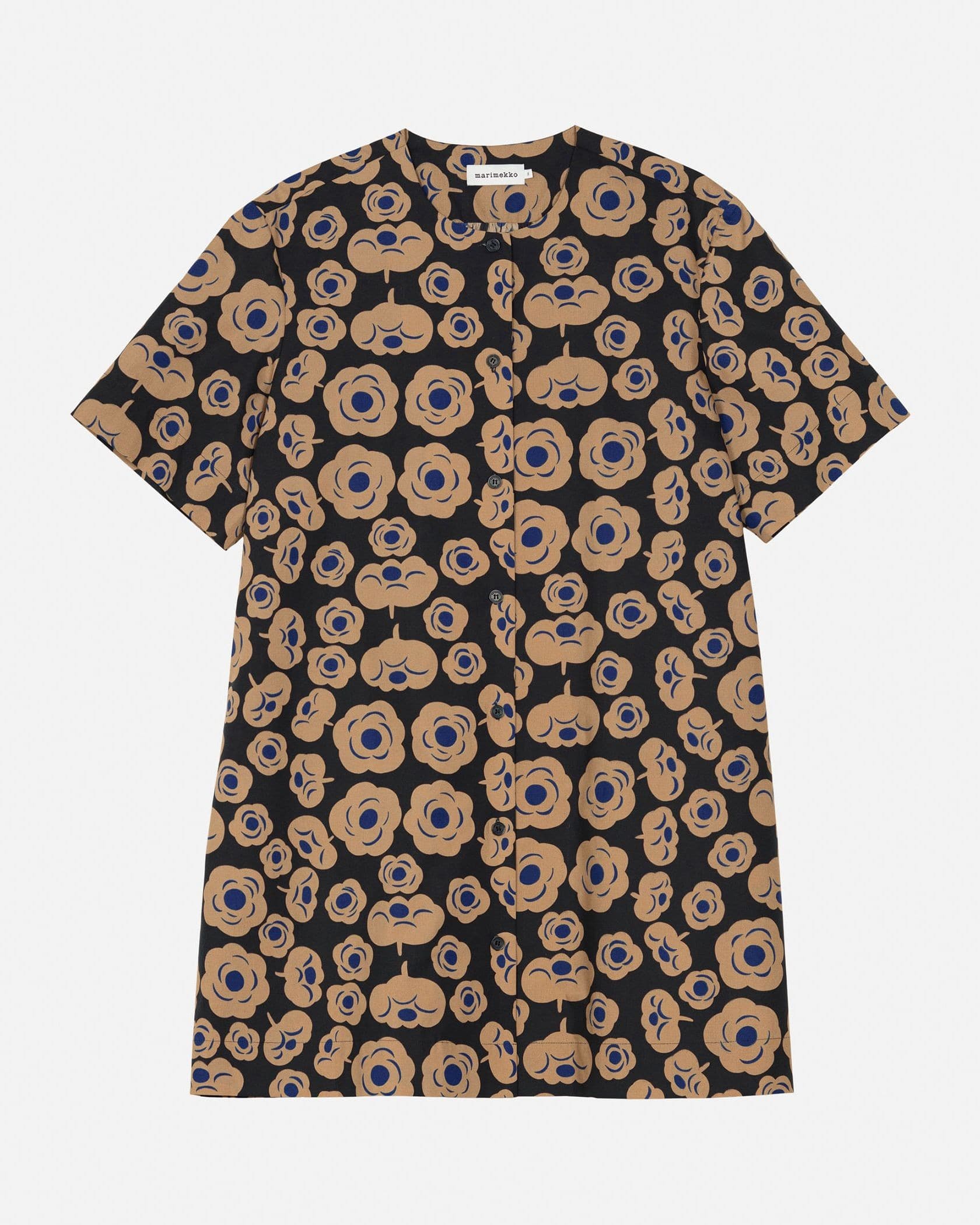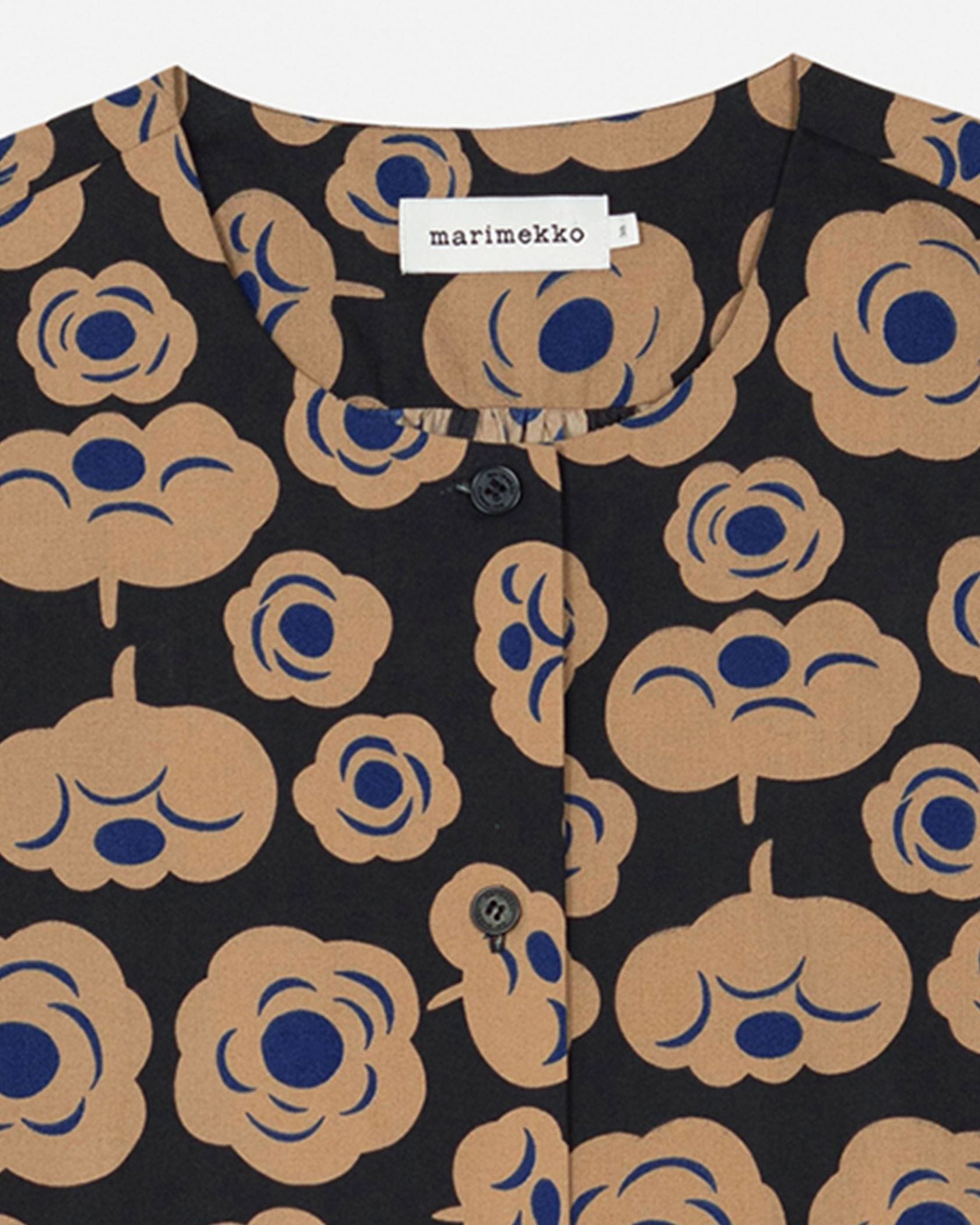 ブラックとベージュ、アクセントカラーにブルーを取り入れたTummaパターンのワンピースです。コットン100%素材を採用。フロントはボタン仕様、ゆったりとしたスリーブがコンフォートなムードを演出。サイドにポケットを配置し、バックヨークの切り替え部分にギャザーを寄せています。