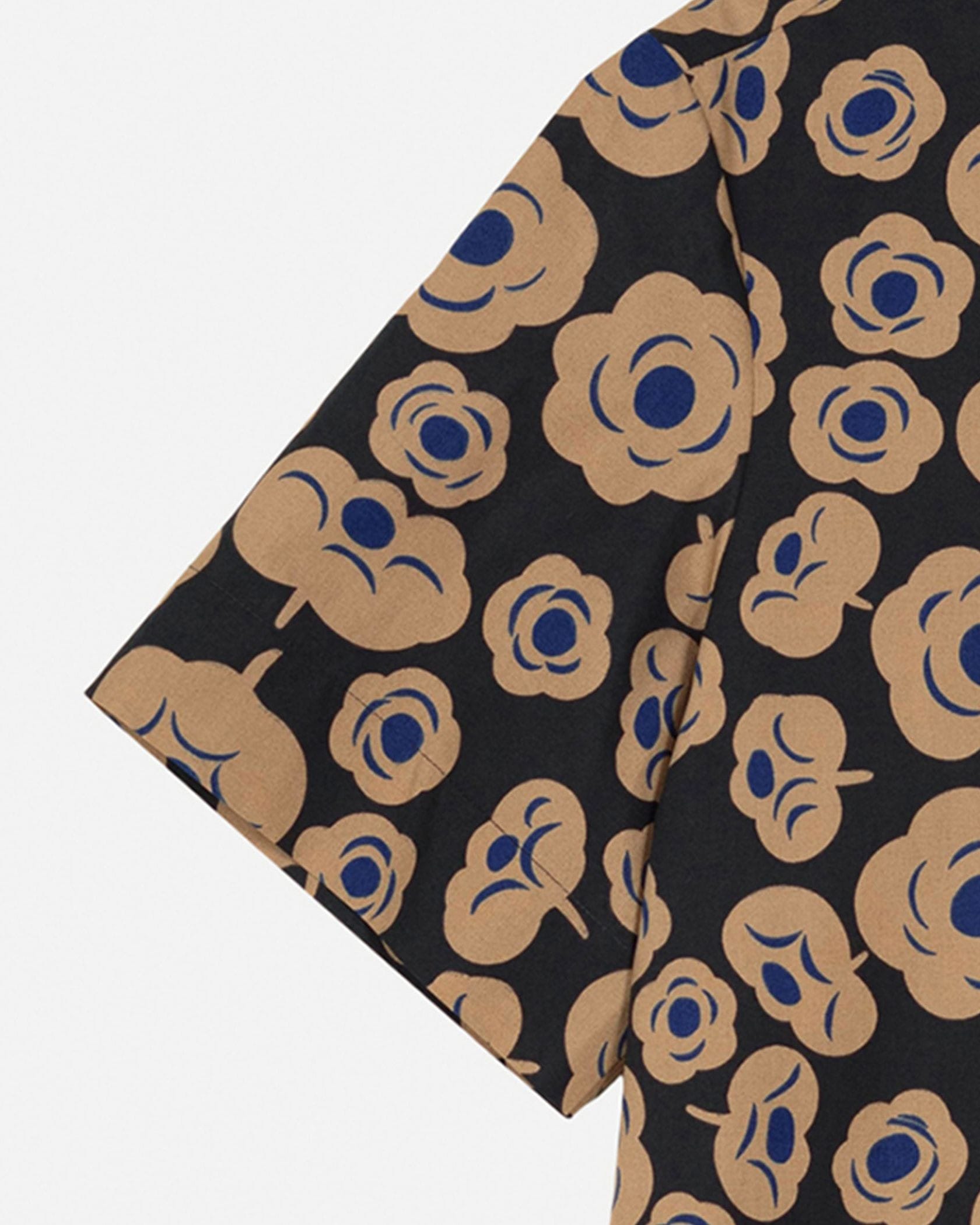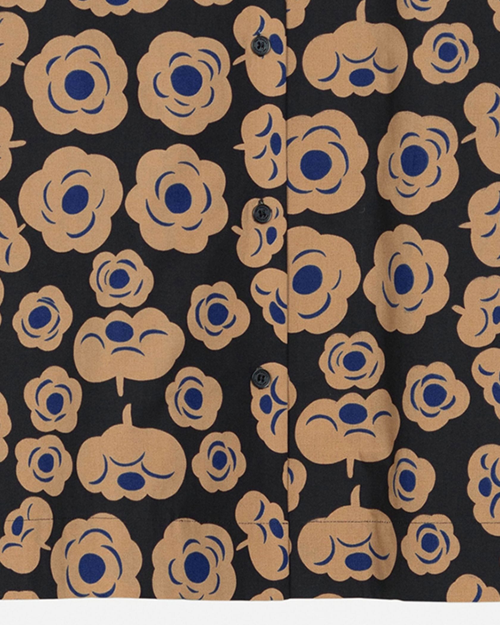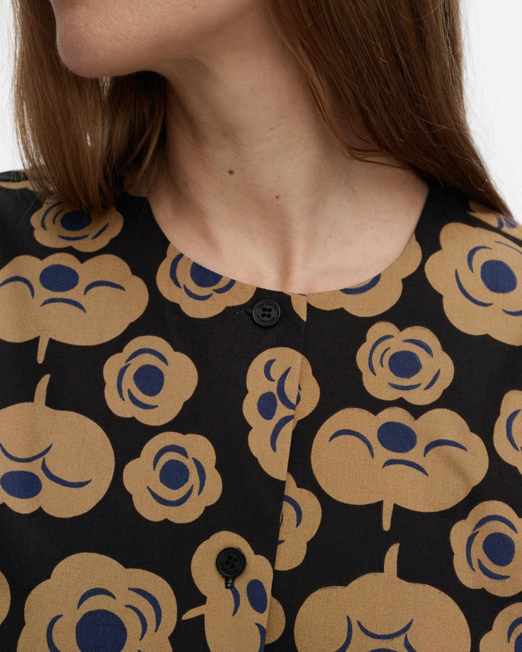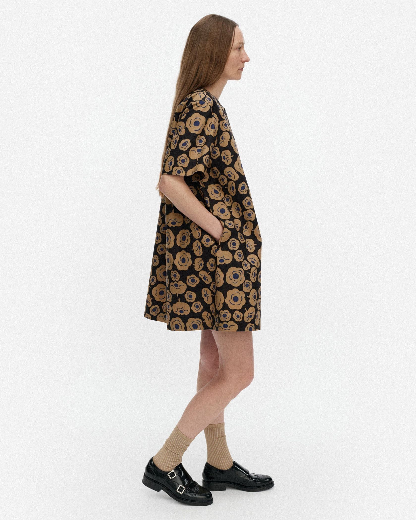 ブラックとベージュ、アクセントカラーにブルーを取り入れたTummaパターンのワンピースです。コットン100%素材を採用。フロントはボタン仕様、ゆったりとしたスリーブがコンフォートなムードを演出。サイドにポケットを配置し、バックヨークの切り替え部分にギャザーを寄せています。
