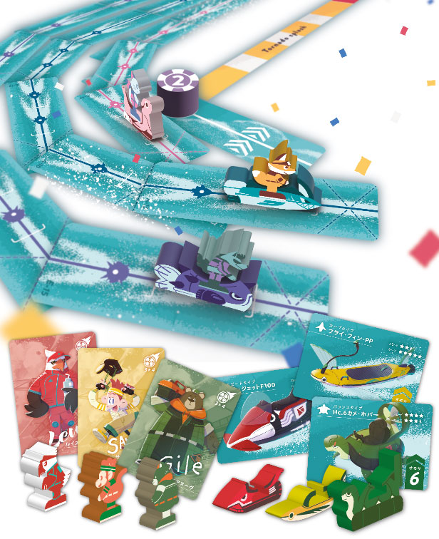 スピードの速いボートやコーナーに強いボートなど、全6種類の中から好きなボートを選び、スピードや曲がる角度が異なるカードをコースに合わせてうまくつなぎ自分のコマを走らせます。