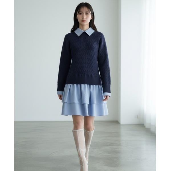 【一枚でレイヤードスタイルが完成するケーブルニットレイヤードワンピース】【Point】・ケーブル編みのニットトップスと、軽やかなティアードスカートをドッキングした一枚で着映えるワンピース。・配色のシャツ襟と袖口がアクセントになり、顔まわりをすっきり上品に演出します。・襟は取り外し可能なので、外せばクルーネックニットワンピースとしても着用できる2wayタイプです。・ティアードデザインになったスカート部分は歩くたびにふんわり揺れる軽やかなシルエット。・ウエスト部分は締め付け感がなく、リラクシーな着心地も魅力です。・袖口にもシャツ素材をレイヤードしたようなデザインを施し、細部まで抜かりない一枚に。ケア方法:手洗い可能透け感:なし裏地:なし伸縮性:ニット部分のみあり光沢感:なし生地の厚さ:中肉