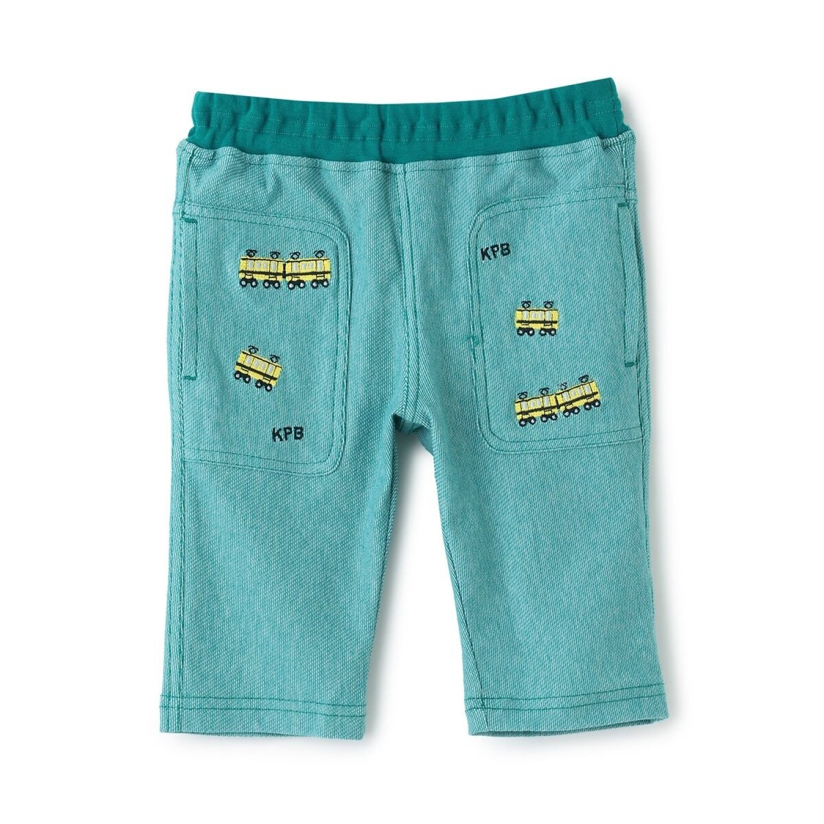 前身の大きなポケットには、配色が目を引く、電車の刺しゅうが入っています。