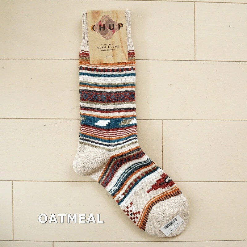 履き心地の良さとオリジナルで素敵な柄が大人気の「チュプ」。現在製造されていないイタリア製ヴィンテージの特殊な編み機を使用し、1目1目ゆっくりと編み上げているため他にはない色鮮やかなニットの風合いを表現。適度な厚みがあるので弾力があり心地良い履き心地です。デザイン柄が非常に複雑なため、1日の生産効率は通常の半分から3分の1程度と作れる量に限りがあります。アイヌ語で「太陽、月、天空の星々」を意味するCHUPは自然が生み出した彩りを丁寧に紡いで、再生糸(エコヤーン)を採用するなど地球環境にも配慮しています。生産は日本。厳選された設備のもと、熟練職人の手による丁寧で精錬されたモノ作りを心がけています。追加生産はなく、数量限定です。