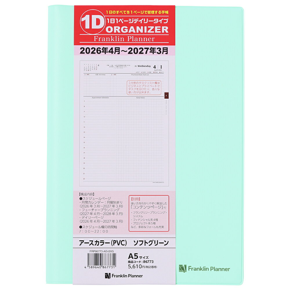 フランクリン・プランナーの1日1ページタイプのデイリー・ダイアリー タイム・マネジメントに必要な機能は全て網羅した1 日1ページのデイリー・ダイアリー。価値観の明確化から日々の計画までフランクリン・プランニング・システムを実践できます。●日付期間(掲載期間):月間:2026 年3 月〜2027 年3 月 デイリー:2026 年4 月〜2027 年3 月●罫内容:月間:ブロックタイプ デイリー:1日1ページタイプ●記入欄:月間予定表ブロック式 デイリー予定表:1日1ページ 月曜始まり●サイズ(判型):A5●寸法:本体サイズ:ヨコ152×タテ221×厚み23mm●色:ソフトグリーン●表紙:PVC●中紙:トモエリバーS●ページ数:本冊:464ページ 別冊:80ページ