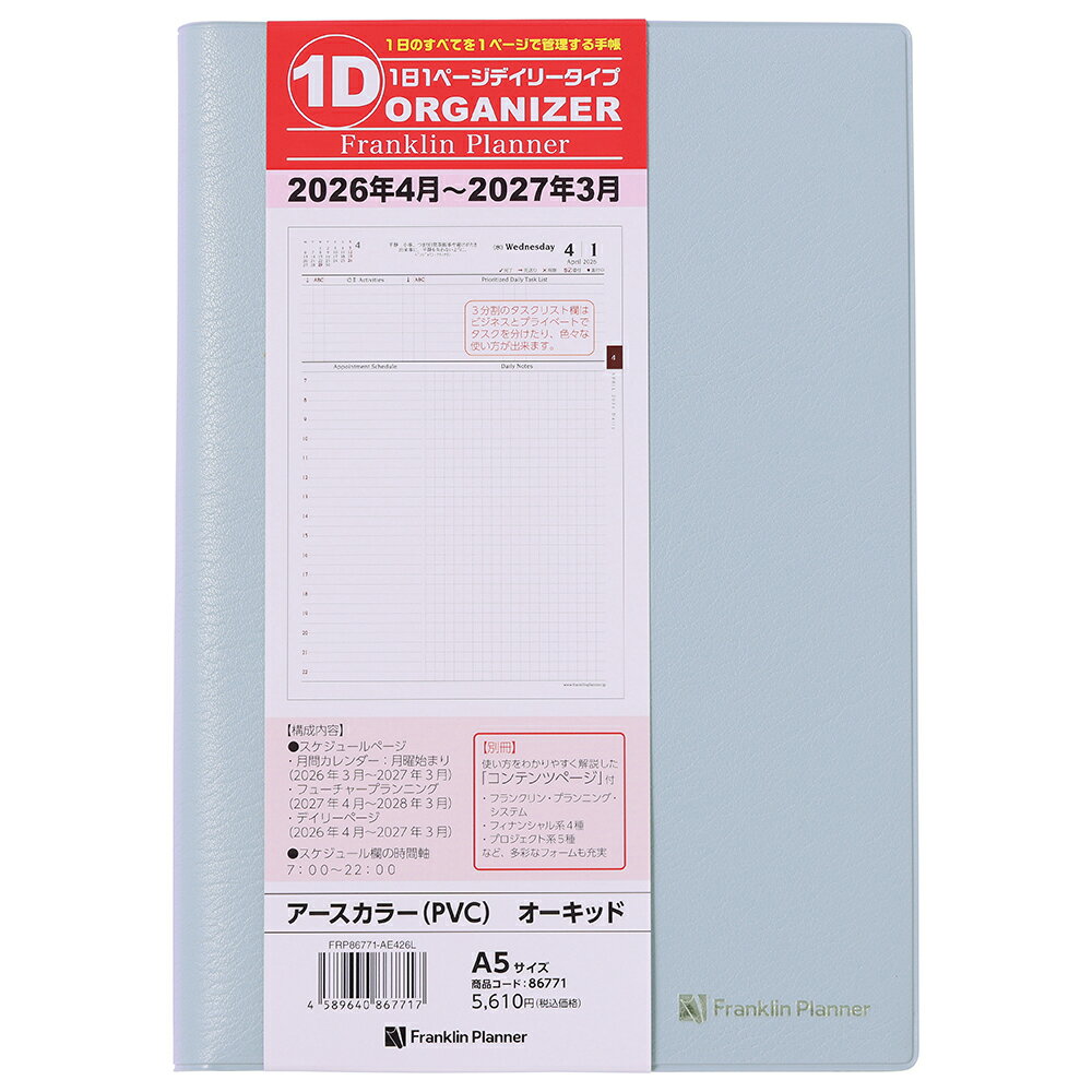 フランクリン・プランナーの1日1ページタイプのデイリー・ダイアリー タイム・マネジメントに必要な機能は全て網羅した1 日1ページのデイリー・ダイアリー。価値観の明確化から日々の計画までフランクリン・プランニング・システムを実践できます。●日付期間(掲載期間):月間:2026 年3 月〜2027 年3 月 デイリー:2026 年4 月〜2027 年3 月●罫内容:月間:ブロックタイプ デイリー:1日1ページタイプ●記入欄:月間予定表ブロック式 デイリー予定表:1日1ページ 月曜始まり●サイズ(判型):A5●寸法:本体サイズ:ヨコ152×タテ221×厚み23mm●色:オーキッド●表紙:PVC●中紙:トモエリバーS●ページ数:本冊:464ページ 別冊:80ページ