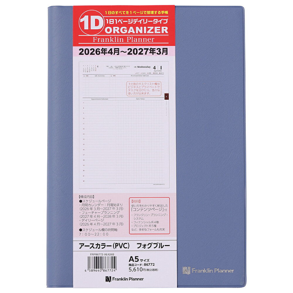 フランクリン・プランナーの1日1ページタイプのデイリー・ダイアリー タイム・マネジメントに必要な機能は全て網羅した1 日1ページのデイリー・ダイアリー。価値観の明確化から日々の計画までフランクリン・プランニング・システムを実践できます。●日付期間(掲載期間):月間:2026 年3 月〜2027 年3 月 デイリー:2026 年4 月〜2027 年3 月●罫内容:月間:ブロックタイプ デイリー:1日1ページタイプ●記入欄:月間予定表ブロック式 デイリー予定表:1日1ページ 月曜始まり●サイズ(判型):A5●寸法:本体サイズ:ヨコ152×タテ221×厚み23mm●色:フォグブルー●表紙:PVC●中紙:トモエリバーS●ページ数:本冊:464ページ 別冊:80ページ