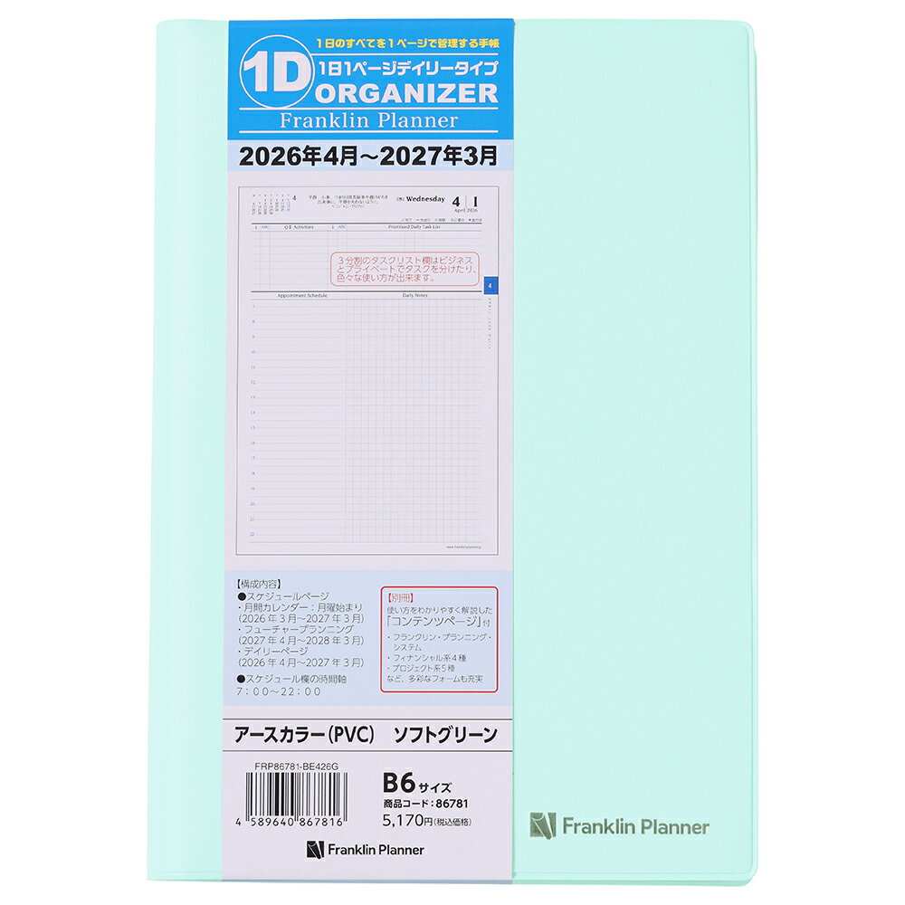 フランクリン・プランナーの1日1ページタイプのデイリー・ダイアリー タイム・マネジメントに必要な機能は全て網羅した1 日1ページのデイリー・ダイアリー。価値観の明確化から日々の計画までフランクリン・プランニング・システムを実践できます。●日付期間(掲載期間):月間:2026 年3 月〜2027 年3 月 デイリー:2026 年4 月〜2027 年3 月●罫内容:月間:ブロックタイプ デイリー:1日1ページタイプ●記入欄:月間予定表ブロック式 デイリー予定表:1日1ページ 月曜始まり●サイズ(判型):B6●寸法:本体サイズ:ヨコ134×タテ192×厚み23mm●色:ソフトグリーン●表紙:PVC●中紙:トモエリバーS●ページ数:本冊:464ページ 別冊:80ページ