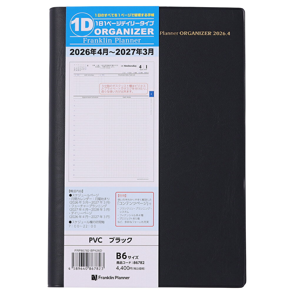 フランクリン・プランナーの1日1ページタイプのデイリー・ダイアリー タイム・マネジメントに必要な機能は全て網羅した1 日1ページのデイリー・ダイアリー。価値観の明確化から日々の計画までフランクリン・プランニング・システムを実践できます。●日付期間(掲載期間):月間:2026 年3 月〜2027 年3 月 デイリー:2026 年4 月〜2027 年3 月●罫内容:月間:ブロックタイプ デイリー:1日1ページタイプ●記入欄:月間予定表ブロック式 デイリー予定表:1日1ページ 月曜始まり●サイズ(判型):B6●寸法:本体サイズ:ヨコ134×タテ192×厚み23mm●色:ブラック●表紙:PVC●中紙:トモエリバーS●ページ数:本冊:464ページ 別冊:80ページ