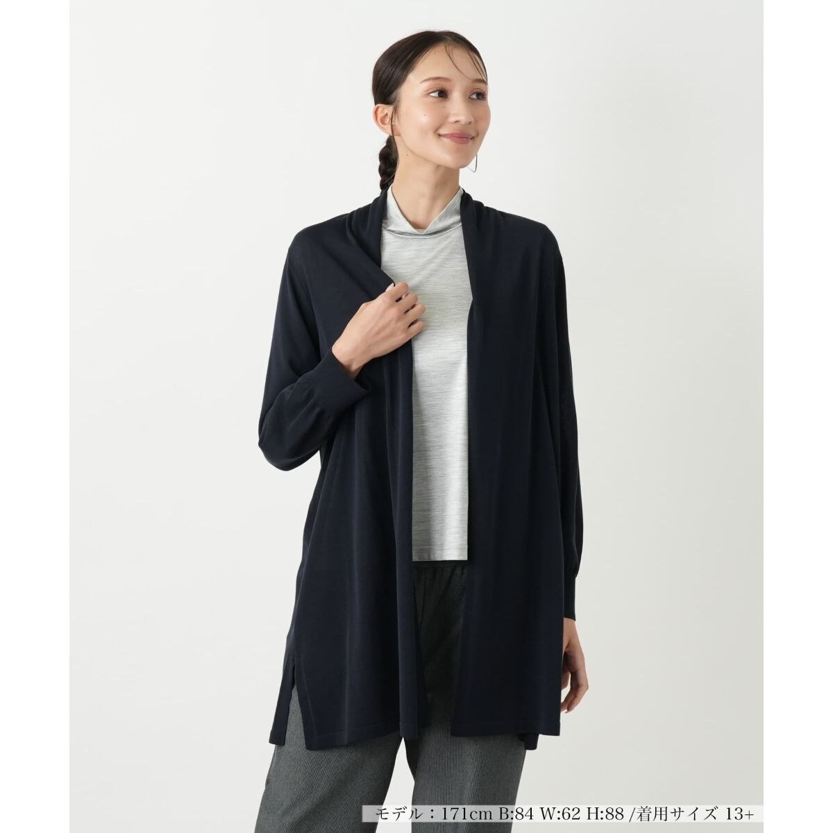 シンプルながらも上品な無地のカーディガンです。装飾を抑えたデザインは、どんなインナーとも自然に馴染み、着回し力が高く活躍します。同素材のアイテムとセットアップで着用すれば、洗練された統一感のある着こなしが完成します。長袖ですので、秋の羽織りとして、また冬のコートインにも最適です。ビジネスシーンからデイリーまで、幅広い場面で活躍する汎用性の高い一枚です。ご自宅で手洗いができるウォッシャブル仕様で、お手入れも簡単に行えます。