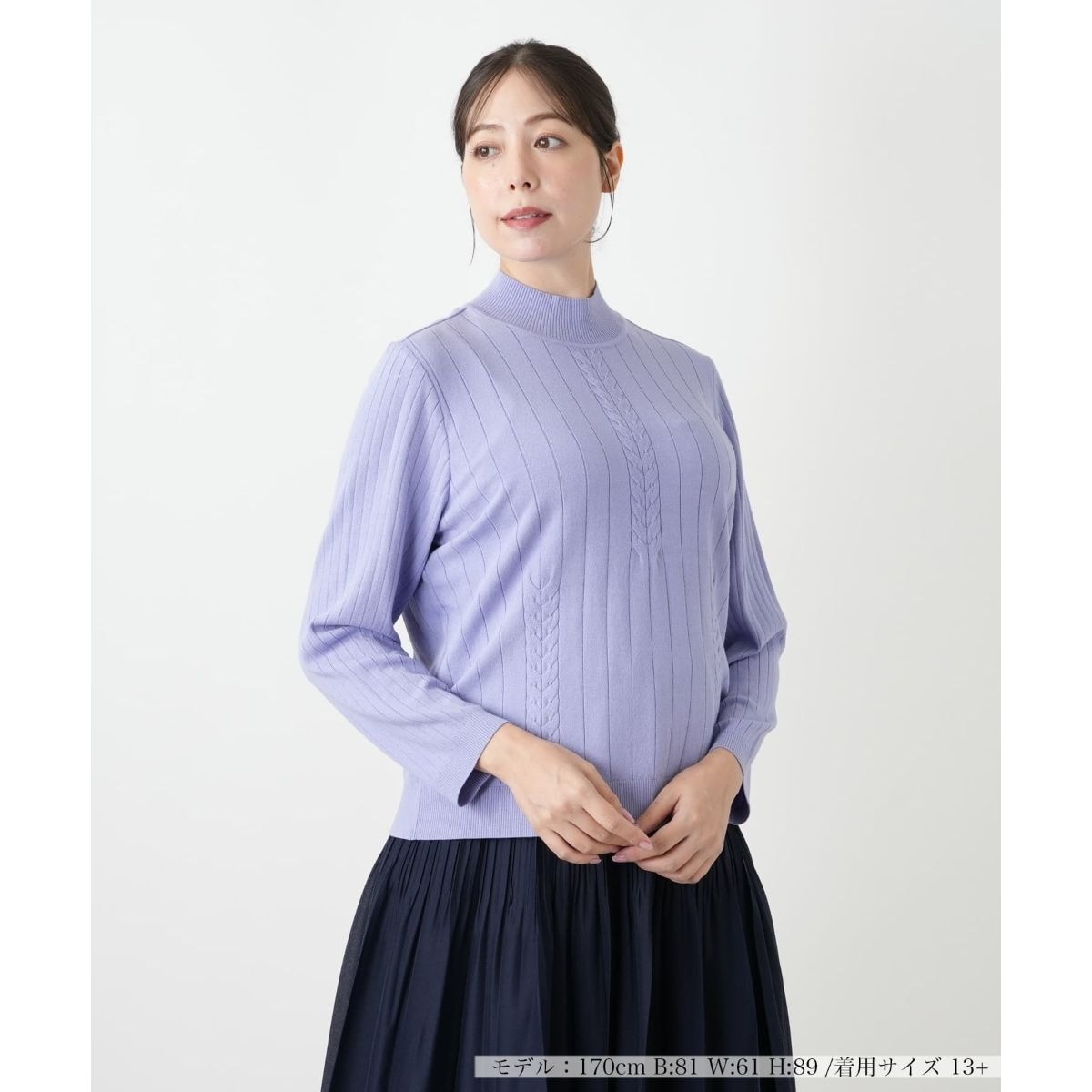 レーヨンとシルクの混紡糸にストレッチ糸を撚り合わせ、さらに2本撚糸を施した、ハイネックニット。ソフトな風合いとふくらみ感が特徴で、着心地の良い一枚です。着やせ効果のあるワイドリブに、部分的にケーブル編みが施されており、シンプルながらも洗練されたデザインが光ります。ハイネックが首元を優しく包み込み、肌寒い季節も暖かくお過ごしいただけます。一枚で着るだけで、上品な印象を与え、様々なコーディネートに便利に着回せるアイテムです。