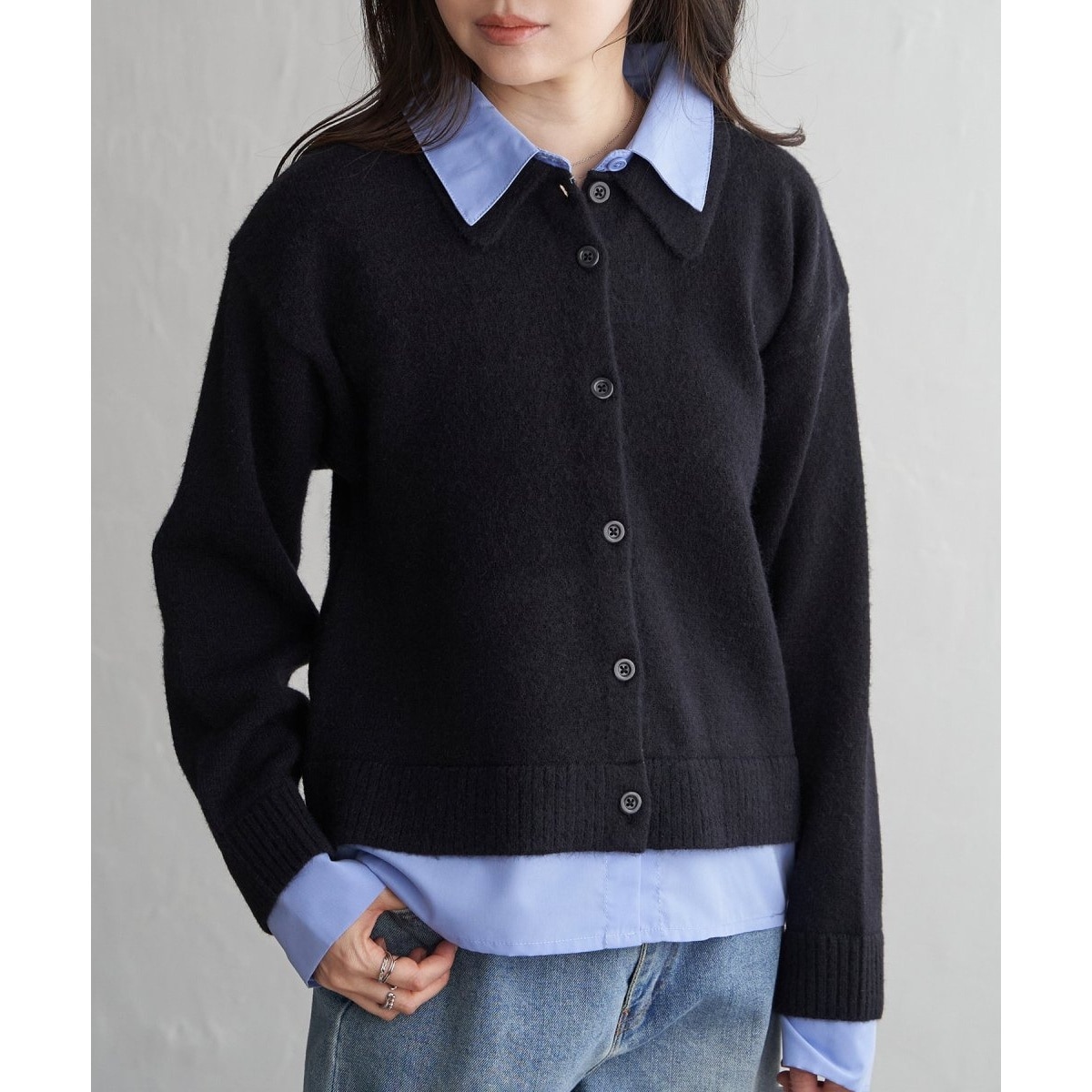 まるでレイヤードしているような着こなしが、一枚で完成するドッキングデザインのカーディガン。
