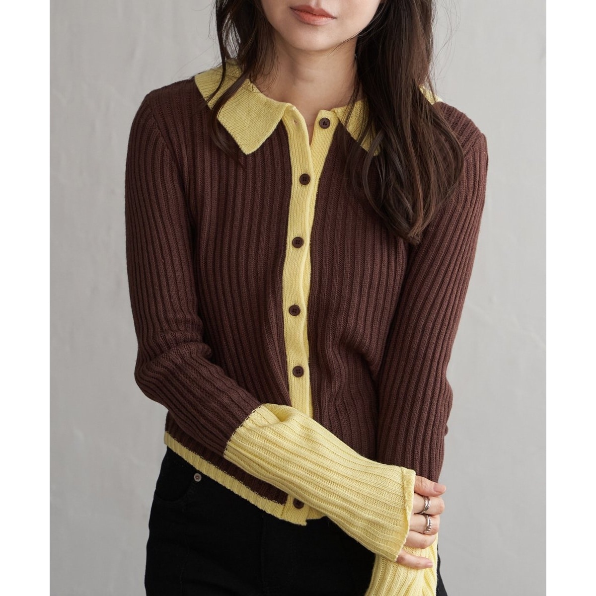 季節の装いにほどよい存在感を添えるバルキー7G配色ポロカーディガン。