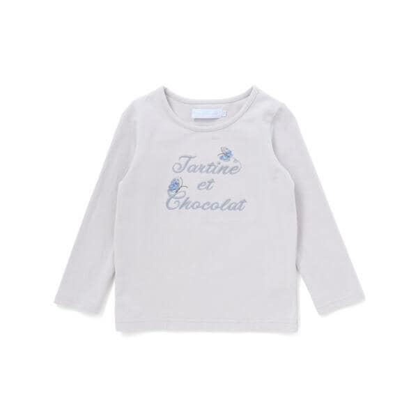 リバティプリントの蝶々のアップリケをあしらった女の子用ロゴ長袖Tシャツです。