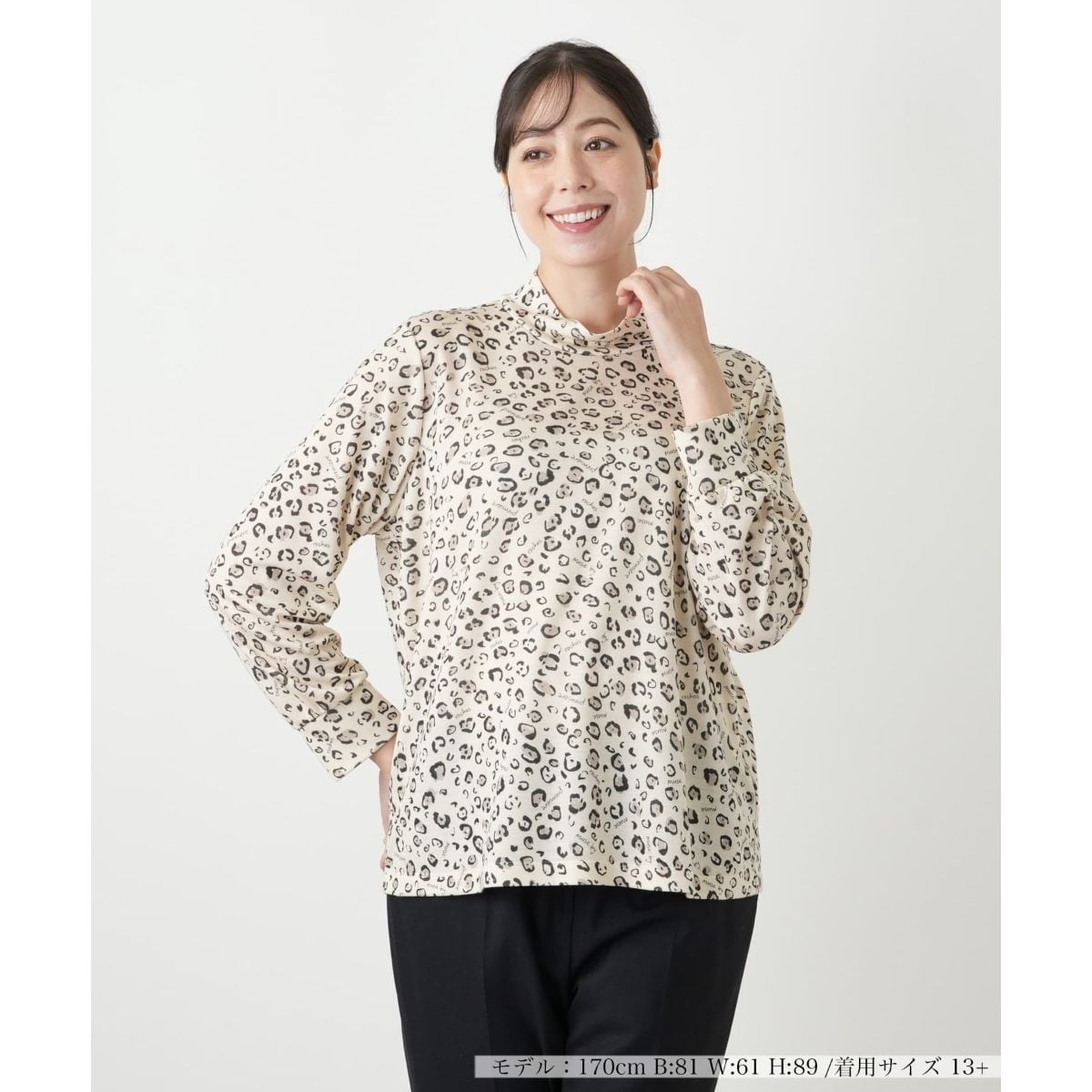 レオパード柄が目を引く、ハイネックカットソー。再生繊維(セルロース)とポリエステルを主体にナイロンをブレンドした素材は、しなやかで心地よい肌触りが特徴です。上品なハイネックは首元を優しく包み込み、肌寒い季節にぴったりです。ご自宅で手洗いできるウォッシャブル仕様で、日常のお手入れも簡単。一枚で着ても、インナーとしても上品に映える、大人の女性のための着回し力の高いアイテムです。秋のコーディネートに遊び心と個性を添える、心地よさとデザイン性を兼ね備えた一枚です。
