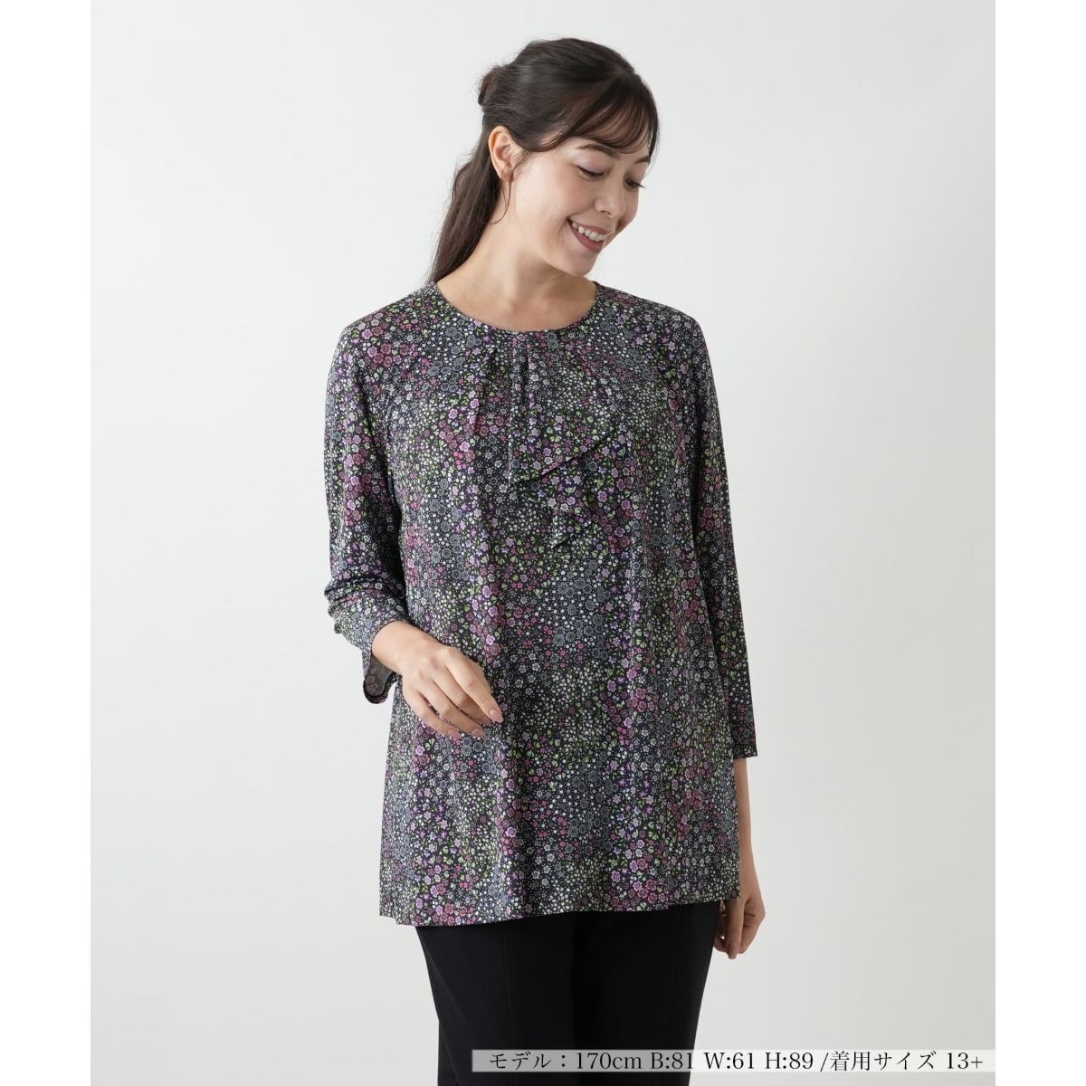 イタリアBINDA社の美しい花柄生地を使用した、肌触りの良いカットソーです。レーヨン混の素材が、さらりとした心地よい着心地を実現。上品な柄が顔周りを華やかに演出し、秋のコーディネートに彩りを添えます。