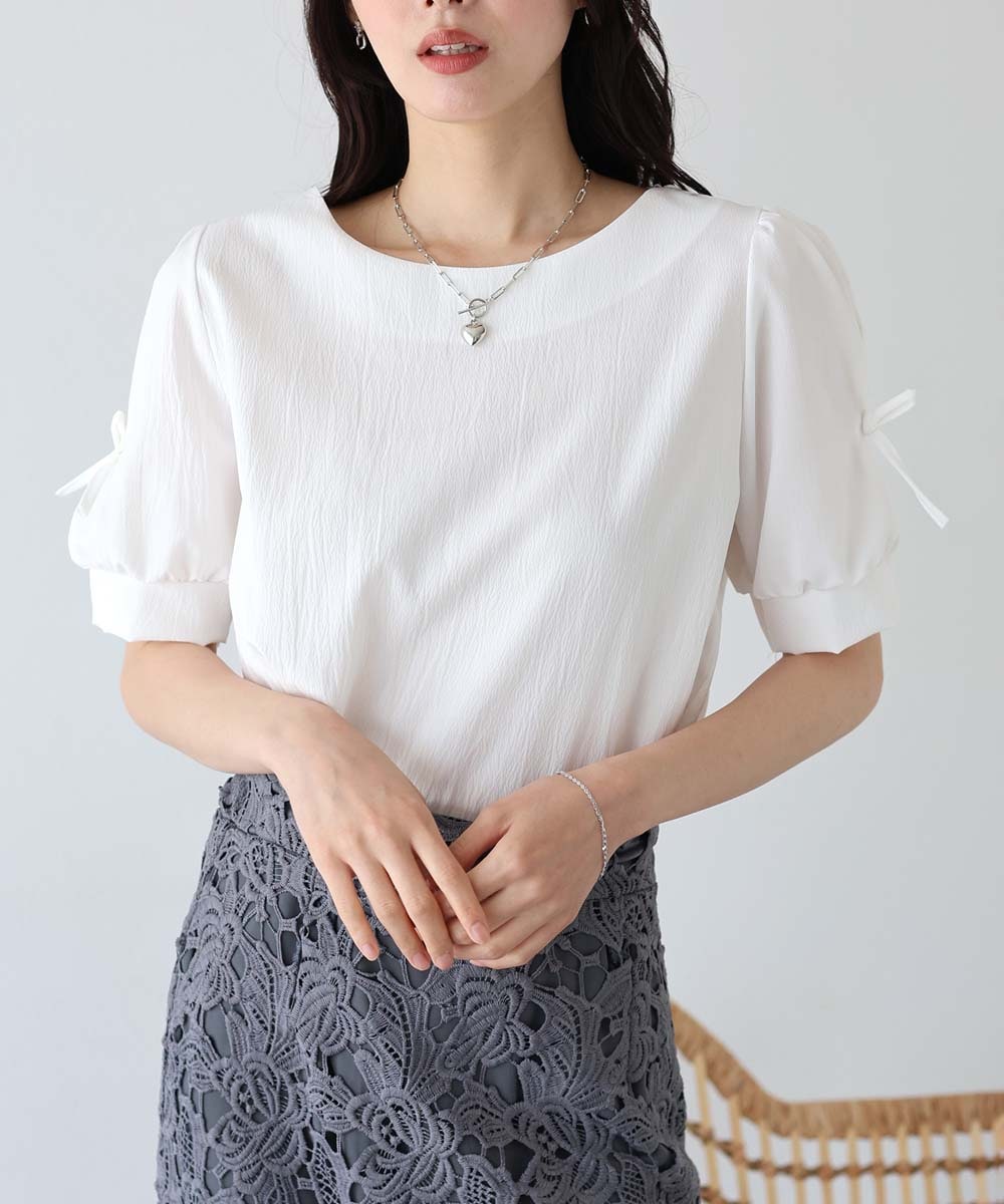 袖にリボンをあしらったきれいめブラウス。