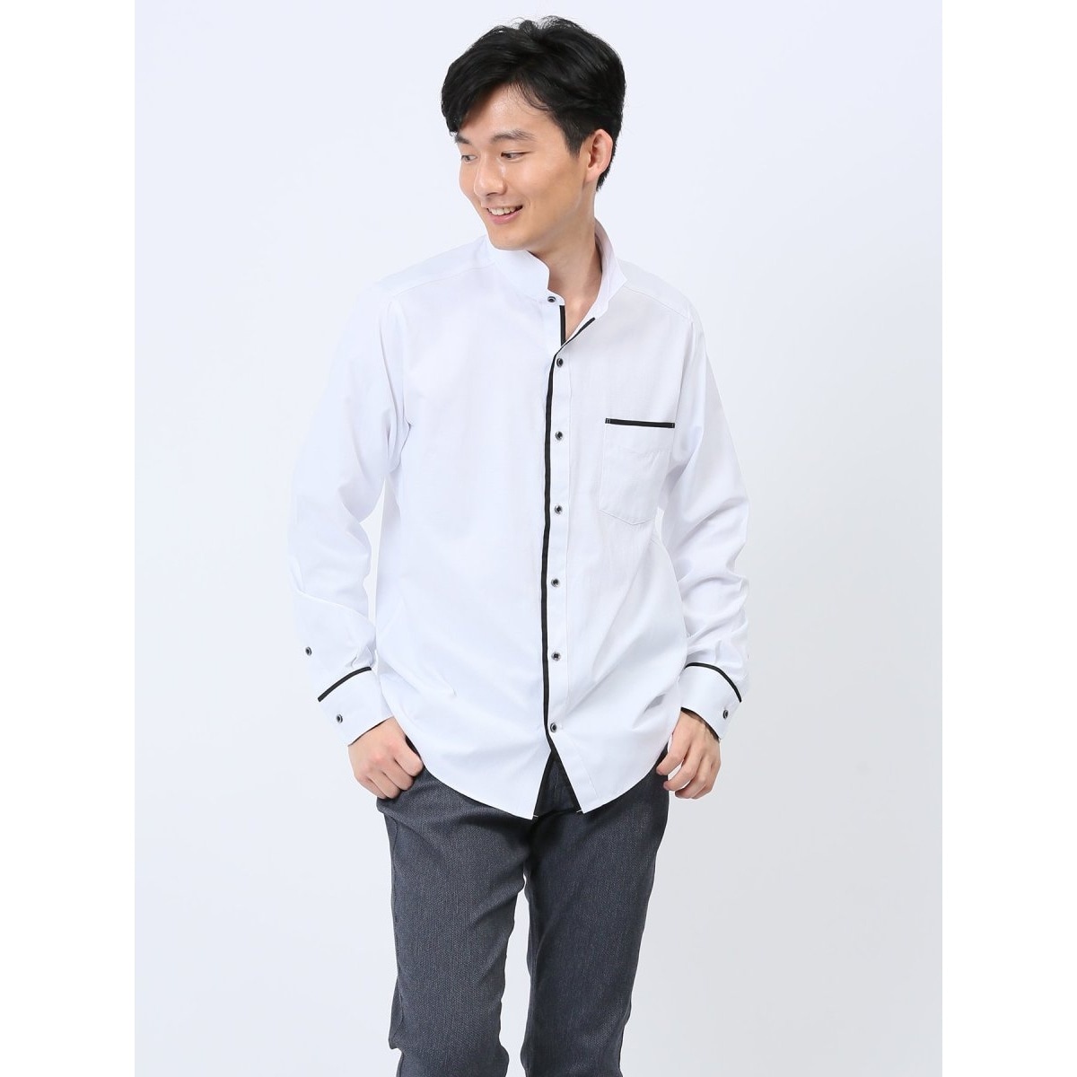 綺麗目なルックスに仕上げた、スタンドカラーの長袖シャツです。前立・ポケット口・カフス裏の別生地切り替えでアクセントを効かせています。キチンと感があるので、プライベートからオフィスカジュアルまでオンオフ兼用で大活躍してくれます。