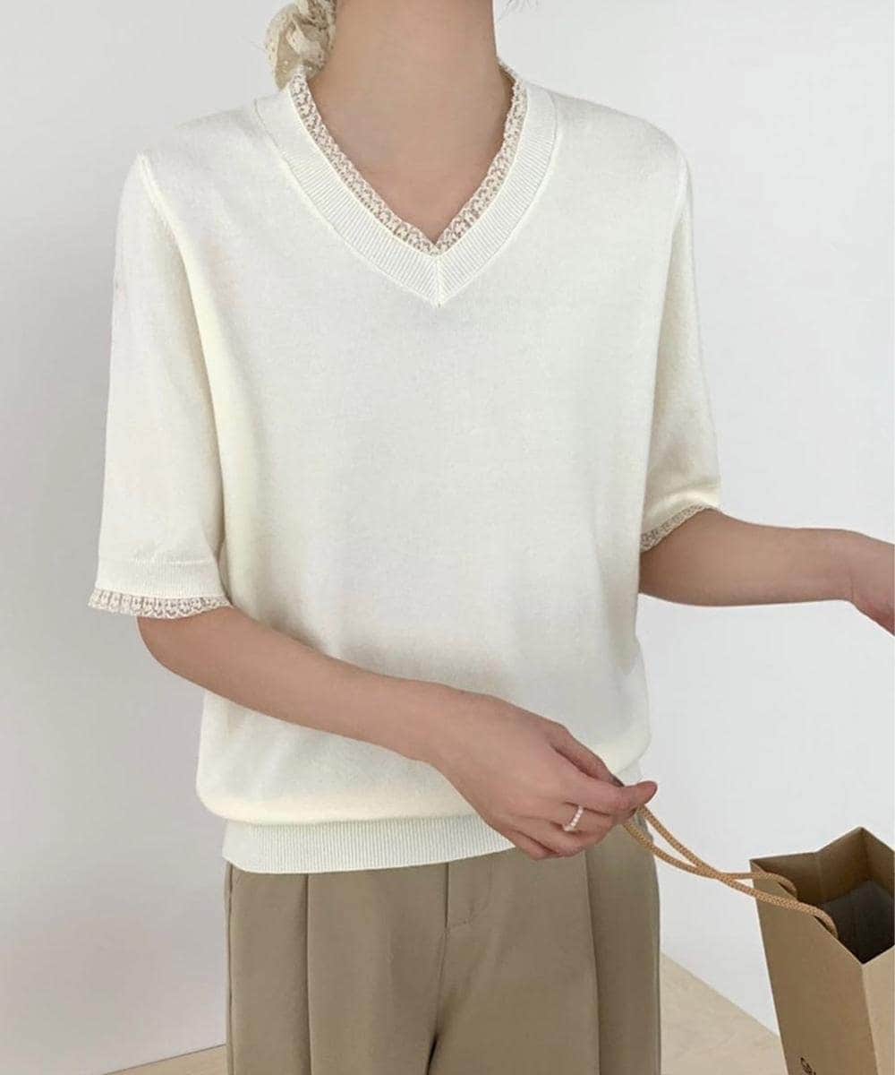 やさしい色合いが魅力のVネック半袖ニット。