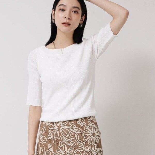胸元にパール調のパーツを編み込んだ半袖プルオーバー。