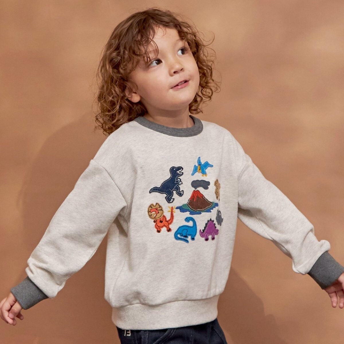 火山の周りに恐竜たちが大集合したアップリケが楽しいトレーナー。