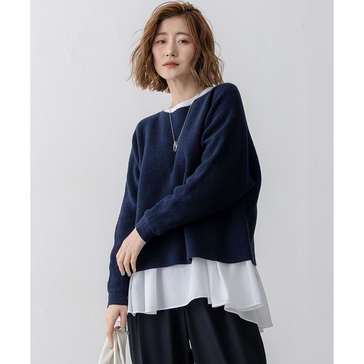 ほど良くナチュラルなツヤ感が普段づかいにも活躍するクロップドレングスのボートネックニット。畦編みを横使いにしたドルマンデザインで、袖下をもたつかないゆるみの絶妙なサイジングに仕上げることで、すっきりと着られるよう工夫しました。一枚で着るのはもちろん、カットソーやブラウスとのレイヤードスタイルも映えるシンプルなデザインです。サラサラとした素材感が春らしく、冬のニットとは違った雰囲気を楽しめます。カラーは、やわらかなベージュ(#533)、春らしいイエロー(#540)、深みのあるネイビー(#575)の3色展開です。