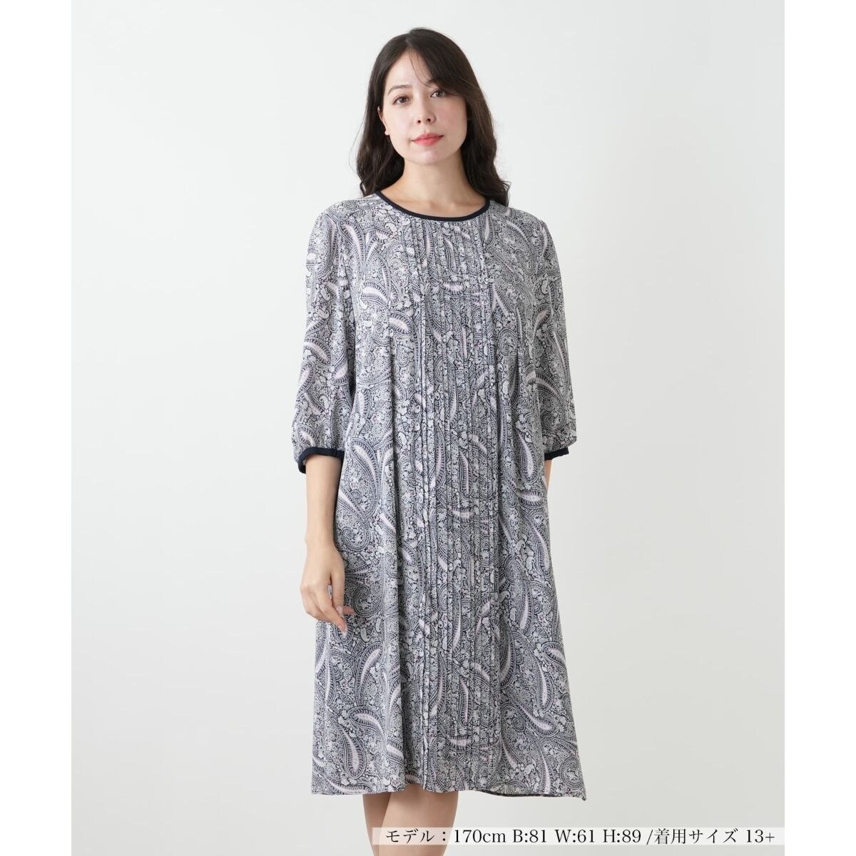 リュクス感溢れる大人のスタイリングが完成する、クラシカルなペイズリー柄のワンピース。胸元に施された繊細なプリーツが縦のラインを演出し、すっきりとした印象に見せます。首元や袖口の配色トリミングが、全体を引き締めるアクセントに。アンダースカート付属のため、軽やかな素材の透け感を気にせず着用可能。エレガントなデザインでありながら、ご自宅で手洗いできるイージーケアも魅力です。