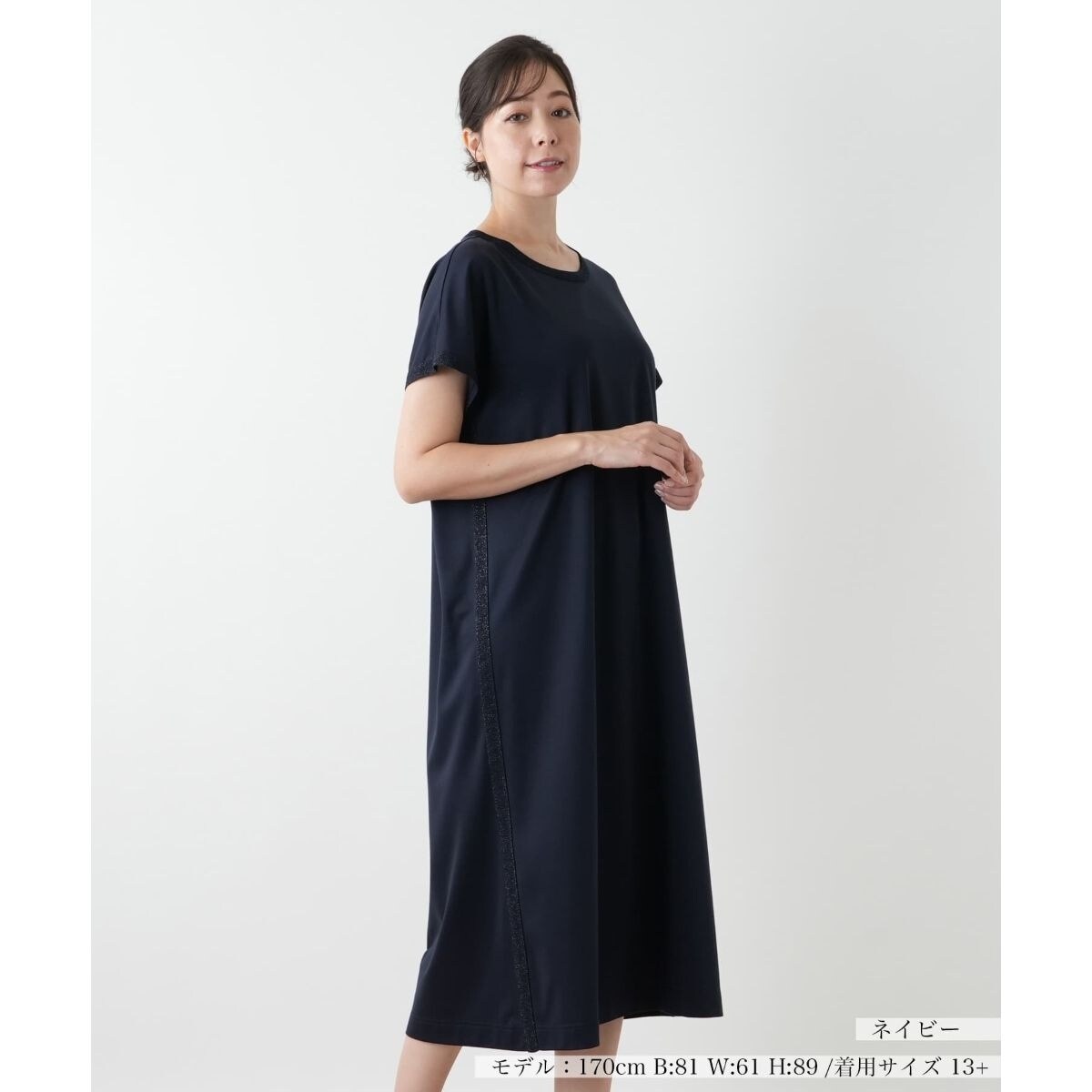 すとんと落ちる、美しいドレープ感が魅力のロングワンピース。襟ぐりや袖繰り、サイドにあしらった繊細なラメコードが、動くたびにきらりと上品な輝きを放ち、ミニマルなデザインにフェミニンな華やかさをプラス。身体のラインを拾わないリラクシーなシルエットで着心地も抜群。一枚でさらりと着るだけで、計算された大人のこなれ感を演出します。アクセサリーや小物次第で、普段使いからお出かけまで様々な表情を楽しめるのも嬉しいポイント。カーディガンやジャケットを羽織れば、秋冬のコーディネートにも活躍します。