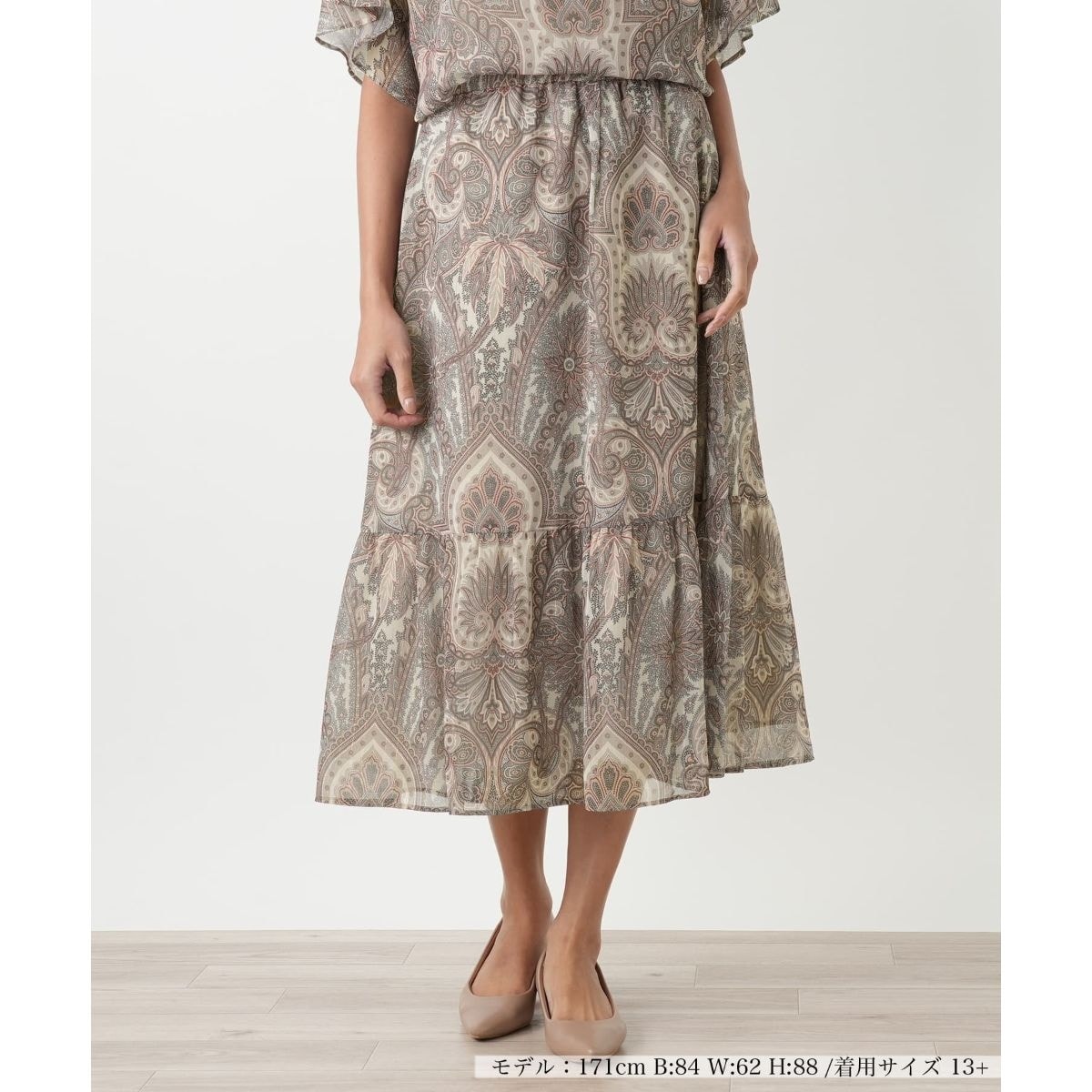 繊細に描かれたヴィンテージライクなペイズリー柄が、深まる秋のムードを運んでくるロマンティックなティアードスカート。裾に向かってふんわりと広がる軽やかなシルエットが魅力です。風をはらんでエアリーに揺れる裾が女性らしい余韻を残しつつ、ウエストはゴム仕様で穿き心地はストレスフリー。ざっくりとしたニットやブーツと合わせた、甘すぎない秋冬のスタイリングがおすすめです。