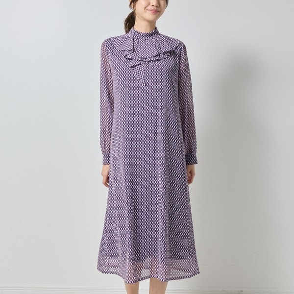 クラシカルなイメージを演出する小紋柄を上品なラメのラインが入った素材にプリントすることで、華やかな印象に仕上げたワンピース。ポイントの襟元のデザインは、アシンメトリーで新しさのあるドレープにこだわりました。ほんのりと透け感のある軽やかな生地を使用し、夏の終わりから秋口にかけて活躍してくれるのも魅力的。1枚で着用したり、ジャケットとのレイヤードも楽しめるアイテムです。