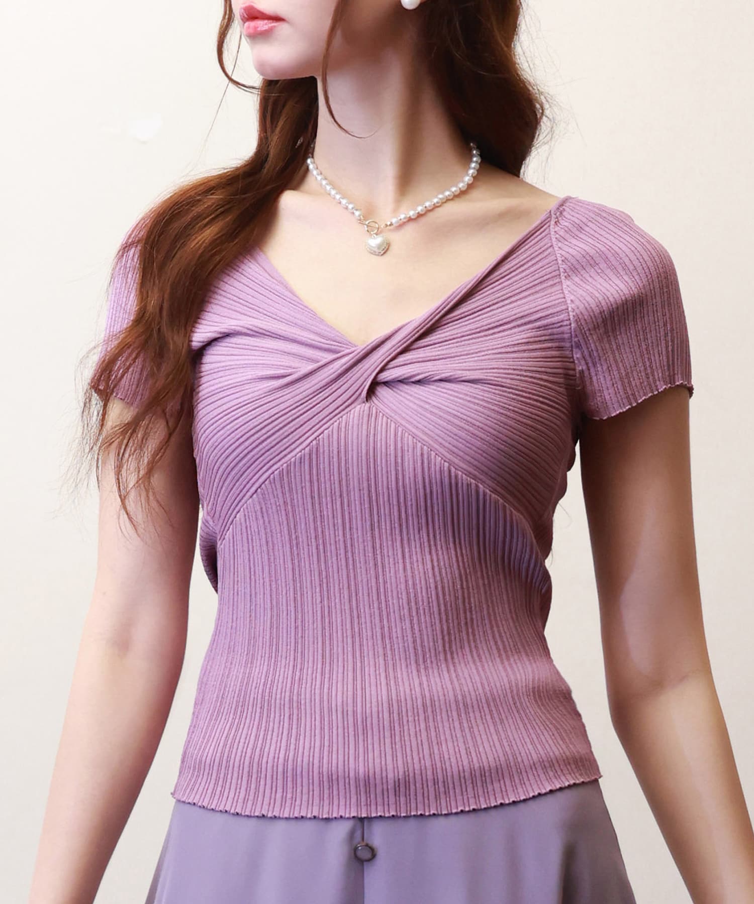 フロントツイストがポイントになった女性らしいデザインの接触冷感素材ニットです。