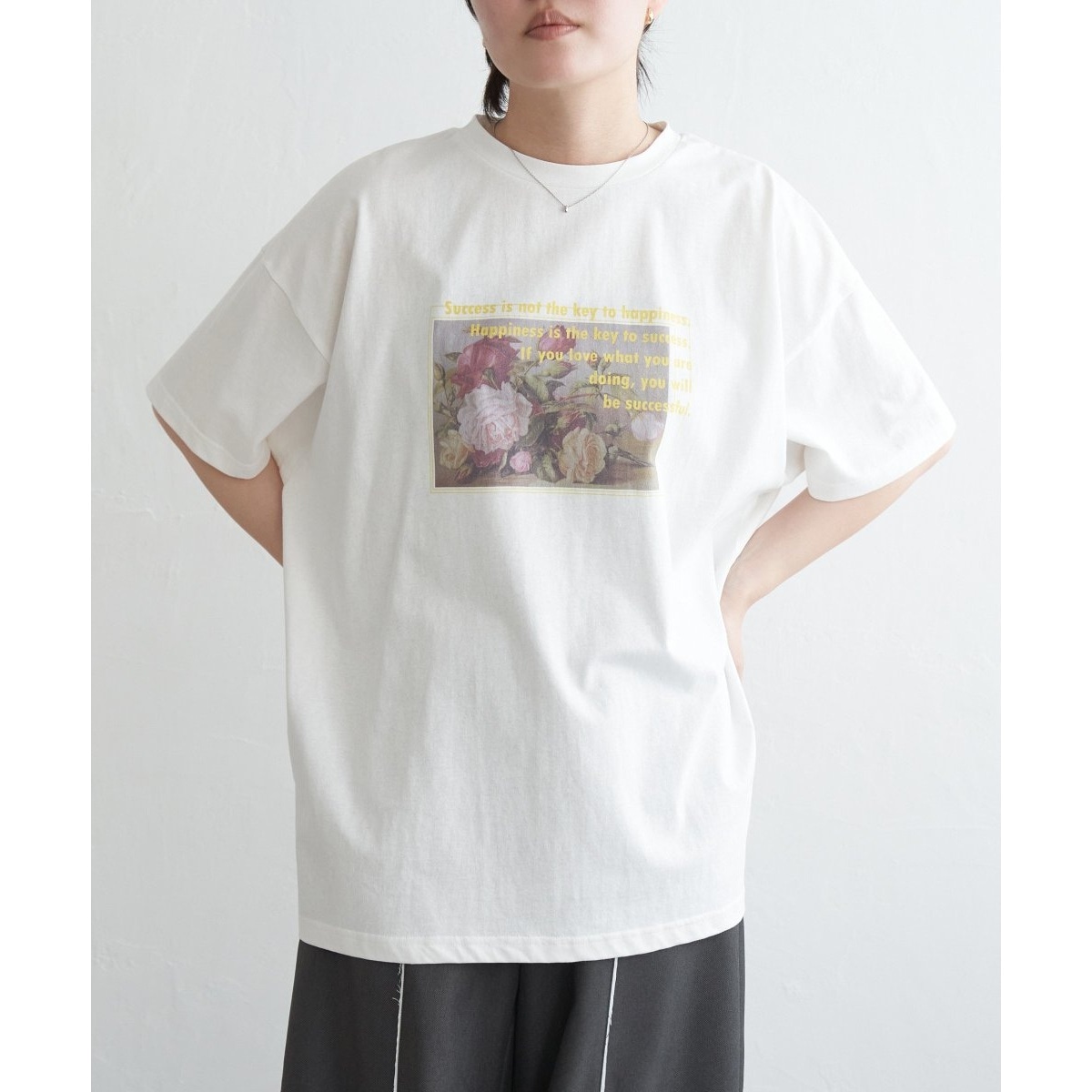 絵画のように美しいフラワープリントをベースに、ロゴが重なることでアートのような雰囲気を醸し出す一枚。