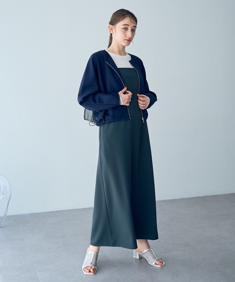 ブルゾンは着心地の良いジャージー素材とチュールの異素材使いでアクセントを付け、ドルマンフォルムで優しい印象に。