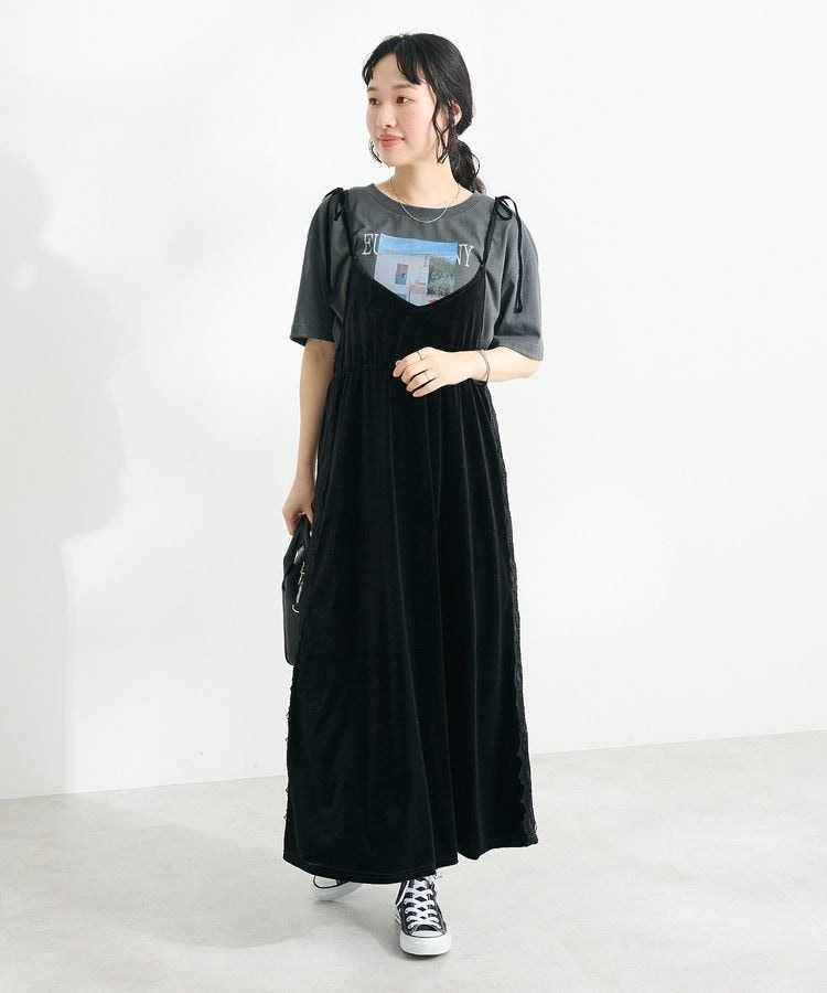 ベロア調素材の上品な光沢感が女性らしい印象のキャミソールワンピース。