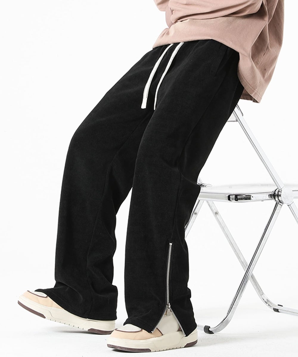 ポリエステル100%で仕立てた、コーデュロイ調のワイドパンツ。柔らかな風合いと程よい光沢感が特徴で、リラックス感のあるシルエットながらも大人っぽい印象のアイテムです。裾にはジップを施し、開閉でシルエットの変化を楽しめるデザインに。ウエストはドローコード付きのイージー仕様で快適な穿き心地。デイリーのカジュアルコーデからルームウェアまで幅広く活躍する一本です