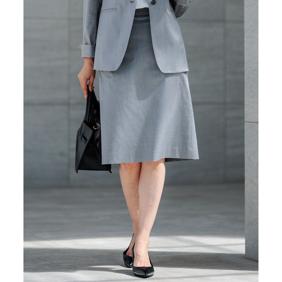 程よく体にフィットするシルエットが美しいタイトスカート。タイトになりすぎないストレート型なので脚のラインを拾い過ぎず着こなせます。膝が隠れる着丈で、後ろの裾にあしらったベント仕様のスリットが脚さばきを良くしつつ、デザインのアクセントにも。同シリーズのジャケットとの着合わせでセットアップにも対応可能です。カラーは、あか抜けた印象で好感度抜群のライトグレー(#003)、安心感ときちんと感のある正統派ネイビー(#075)の2色展開です。
