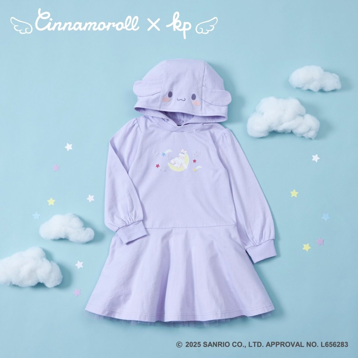 サンリオのキャラクター、シナモロールとコラボした天竺素材のフード付きワンピース。キュートなシナモロールのプリントの回りにラメ刺しゅうを施して、ちょっぴりキラキラ感をだしています。フード部分にはシナモロールのお顔が刺しゅうされていて、取り外し可能です。スカート部分は裏地付きで、裾から透け感のあるチュールが顔を覗かせています。お出かけ着におすすめのアイテムです。90cmは左肩開き仕様です。