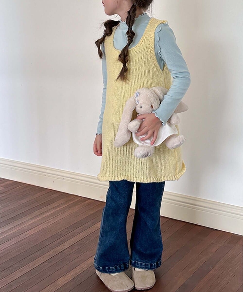 明るく元気な印象を与えてくれるニットワンピース。柔らかいニットで伸縮性があるため、動き回るお子様にもストレスなく着用していただけます。重ね着をしてもゴワゴワしない程よいシルエットに仕上げ、寒い季節にはタートルネックトップスを合わせても◎レギンスやデニムパンツと合わせて、元気いっぱいのカジュアルコーデがおすすめ!スニーカーやパンプスとの相性も抜群です♪