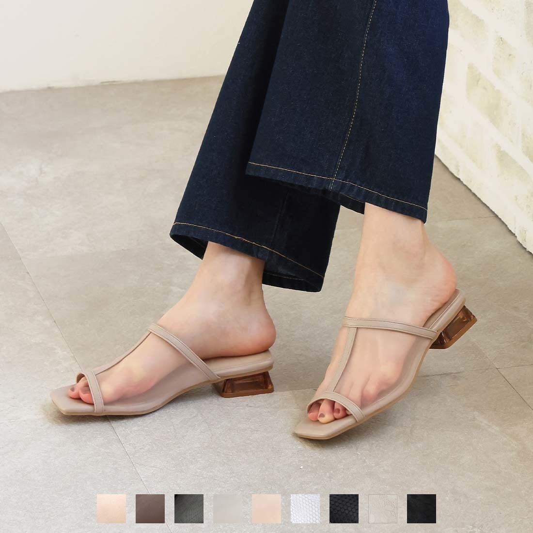 スクエアトゥパールクリアヒールミュールサンダル