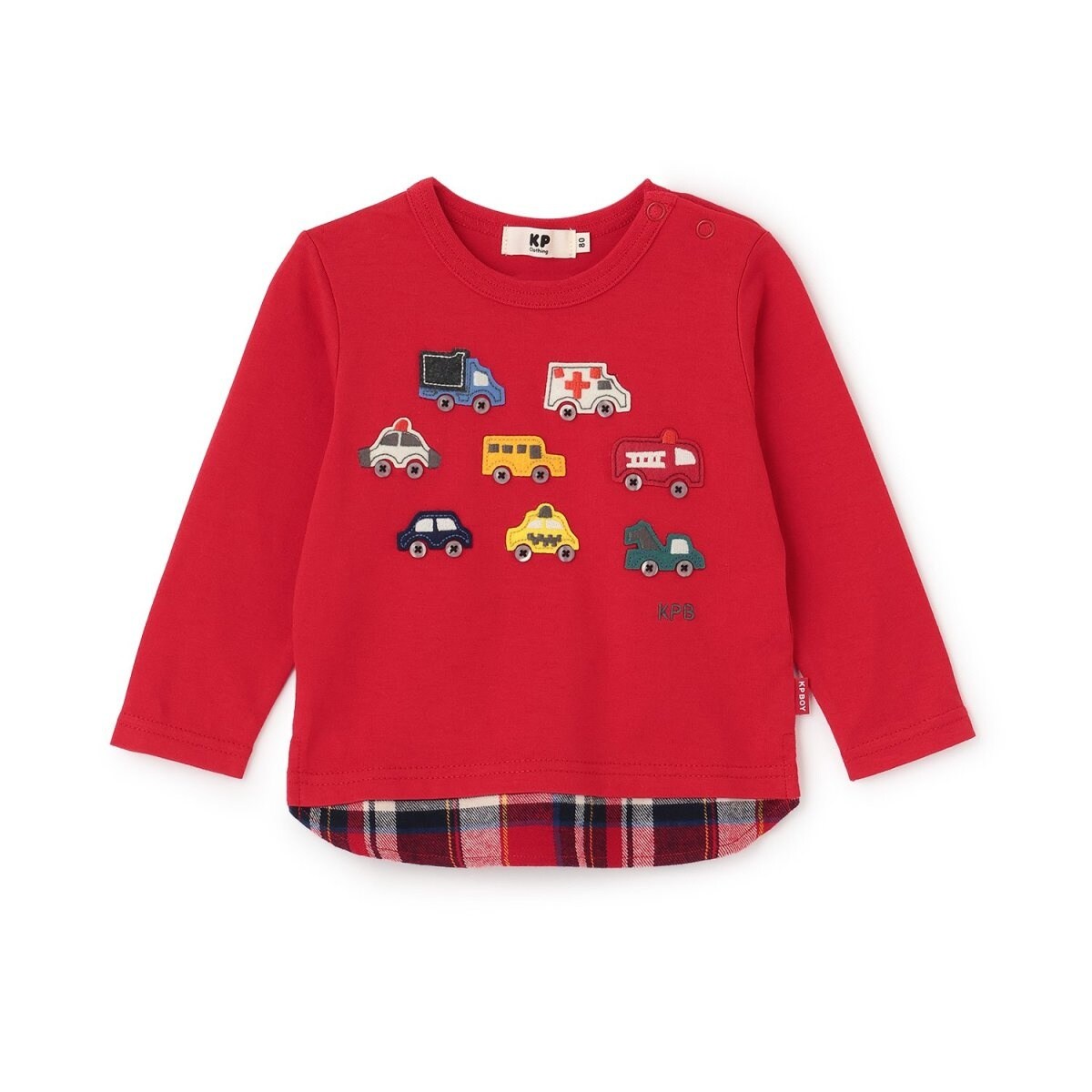 胸には、カラフルに色々な働く車のアップリケが付いていて、ボタンで表現されたタイヤが、ほっこりとしたクラフト感を感じさせます。