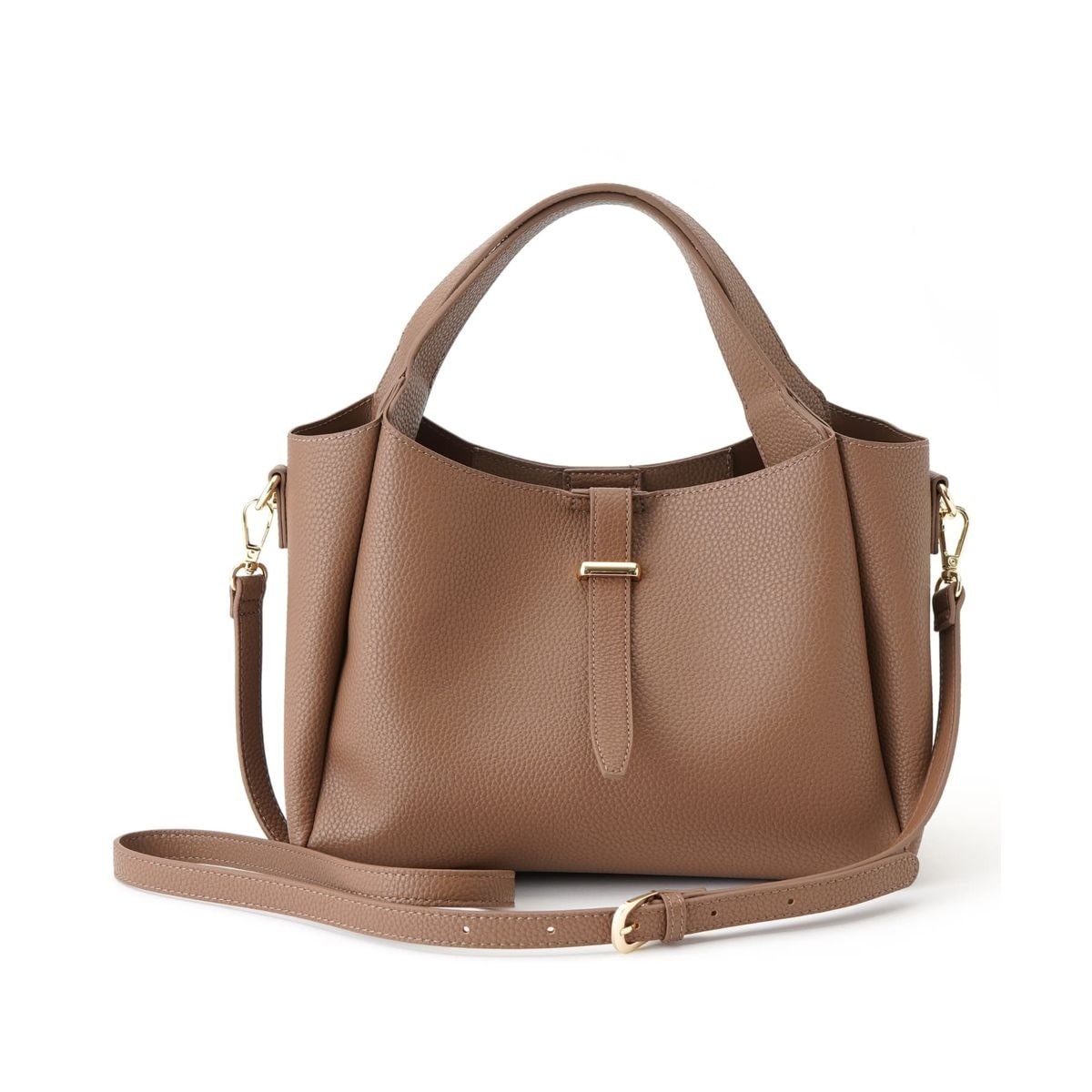 オンオフ問わず幅広いシーンに寄り添う、上品な2WAYトートバッグ。シボ感のあるリッチな風合いの合成皮革と、きらりと光るゴールドの金具が高級感を演出します。取り外し可能なストラップ付きで、その日の気分や服装に合わせてスタイルの変更が可能。マチが広く、長財布やポーチなど日常の必需品がしっかり収まるサイズ感も魅力です。通勤から休日のお出かけまで、シーズンレスで活躍する頼れるアイテムです。