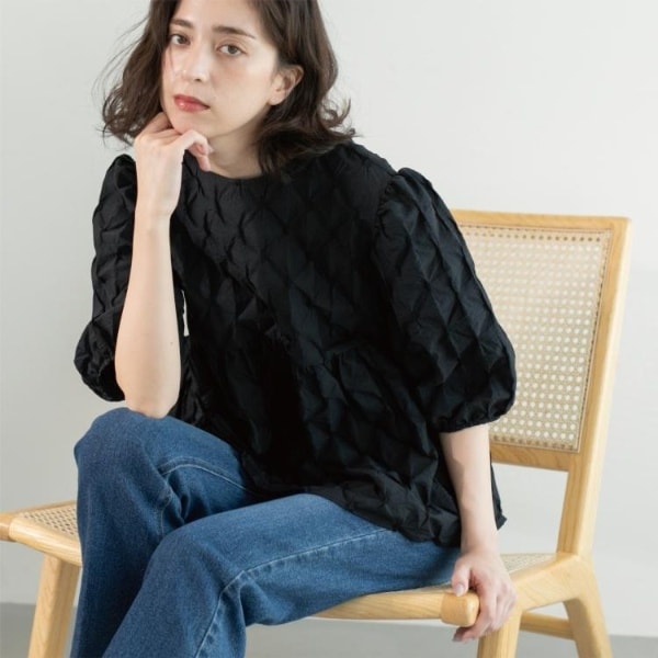 ポコポコ感のあるふくれジャカード素材を使用した、華やかなペプラムブラウス