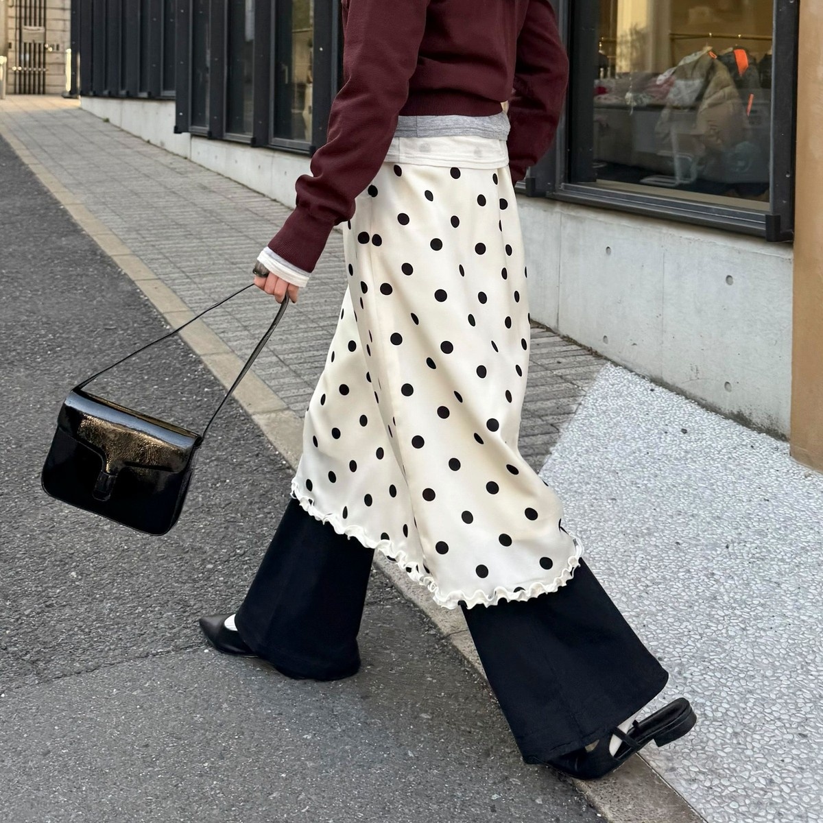 ・サテン素材にドット柄をあしらったミディ丈スカート