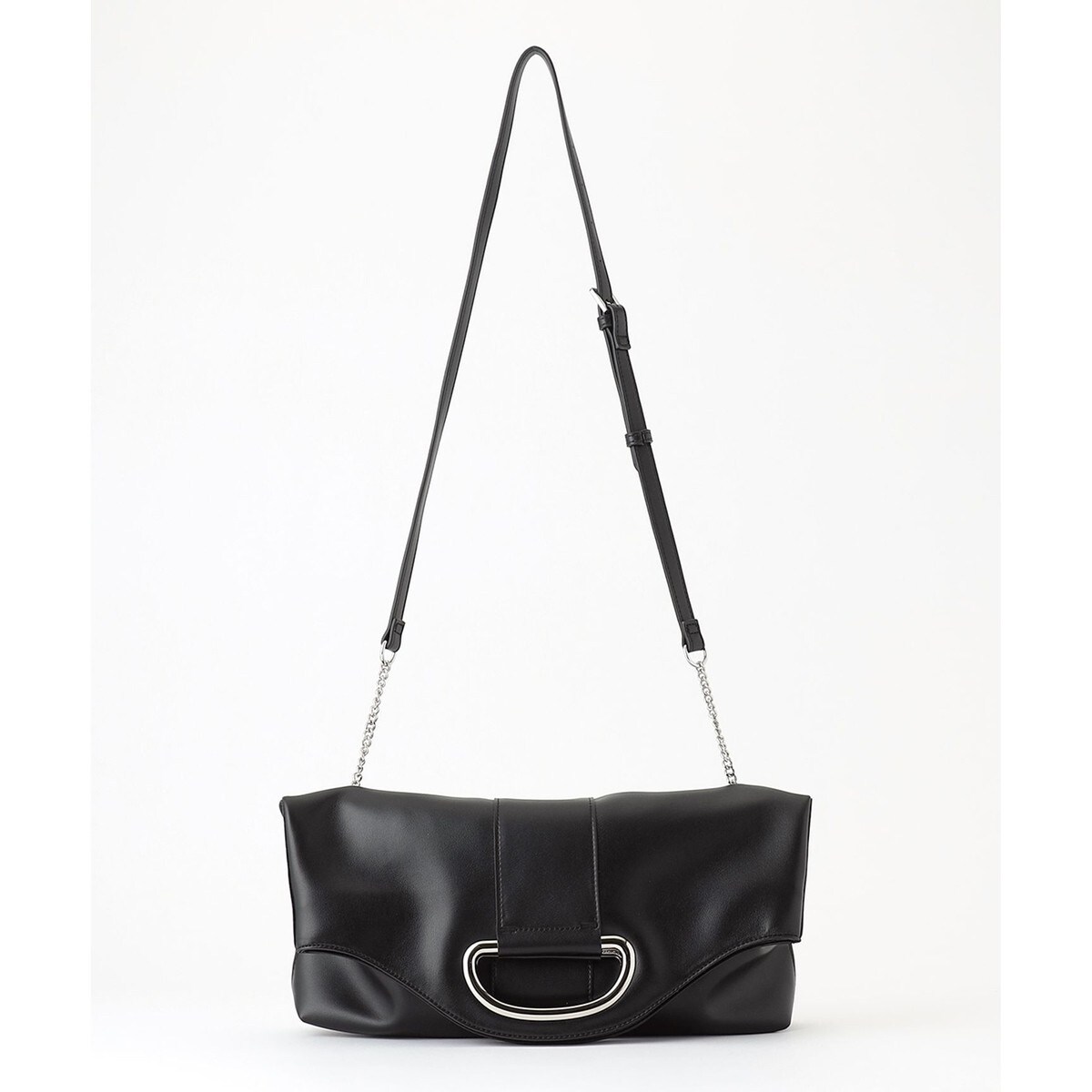 ■デザイントレンドのワイドサイズのクラッチバッグです。くり手のメタルハンドルパーツがポイントです。チェーンショルダーを取り付けると、ショルダーバッグとしてもお使いいただける2WAY仕様です。