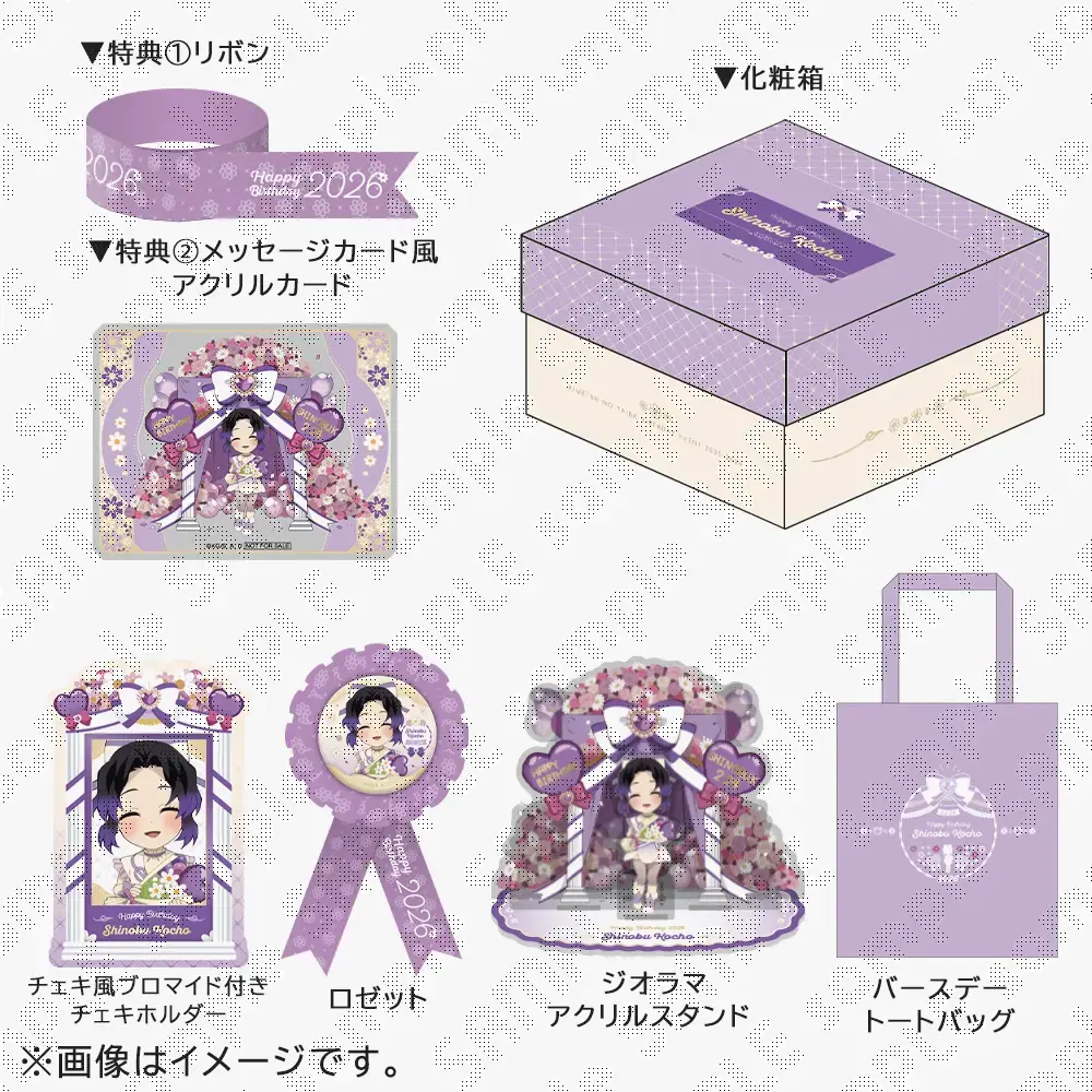 特別なデザインで彩ったこのBOXでは、誕生祭2026グッズ全4点に加えて、BOX特典としてホログラム入りアクリルカードとラッピングリボンも一緒にお届け。