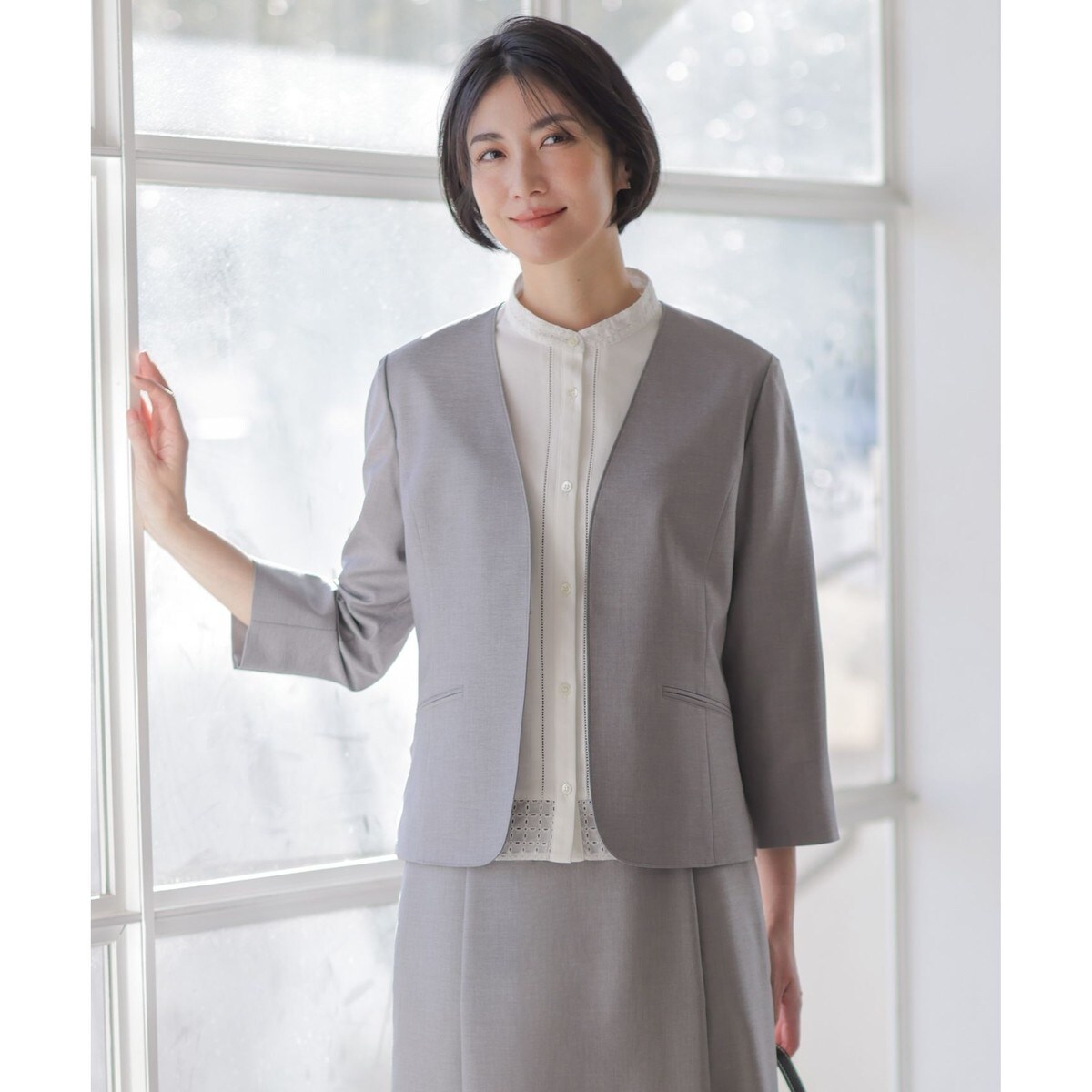 ■デザイン羽織感覚でさらりと着られる、軽やかなノーカラージャケット。フロントはホック1つで留めるミニマルなデザインにし、シャープなVネックがデコルテラインをすっきりと見せてくれます。バックスタイルはウエスト部分に切り替えを入れ、シンプルながらもメリハリのあるシルエットに仕上げました。8分袖でリターンできる設定にしており、手首まわりを見せて抜け感のある軽やかな雰囲気に。裏なしです。