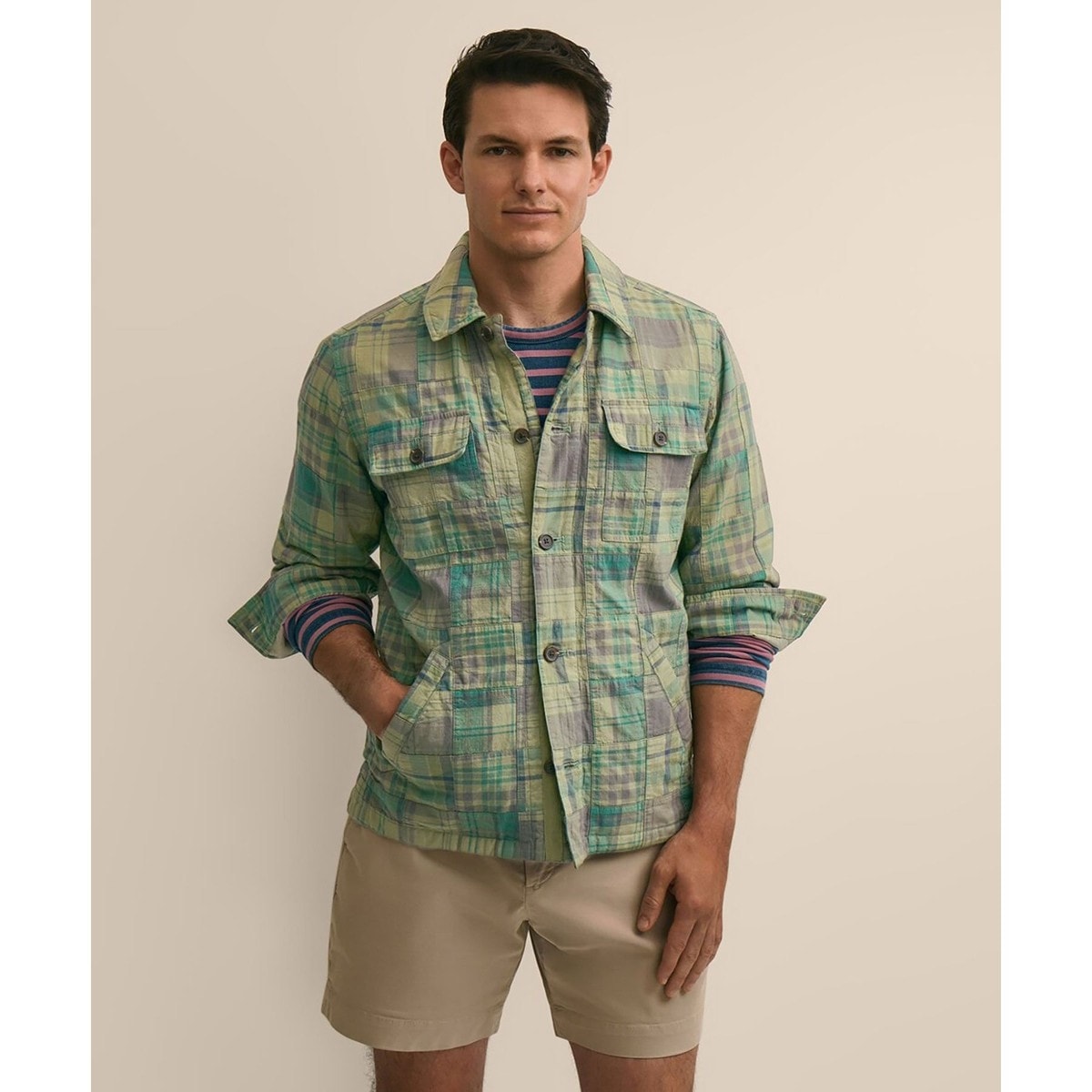 グリーンのマドラス生地をパッチワークしたヴィンテージ風のシャツジャケット