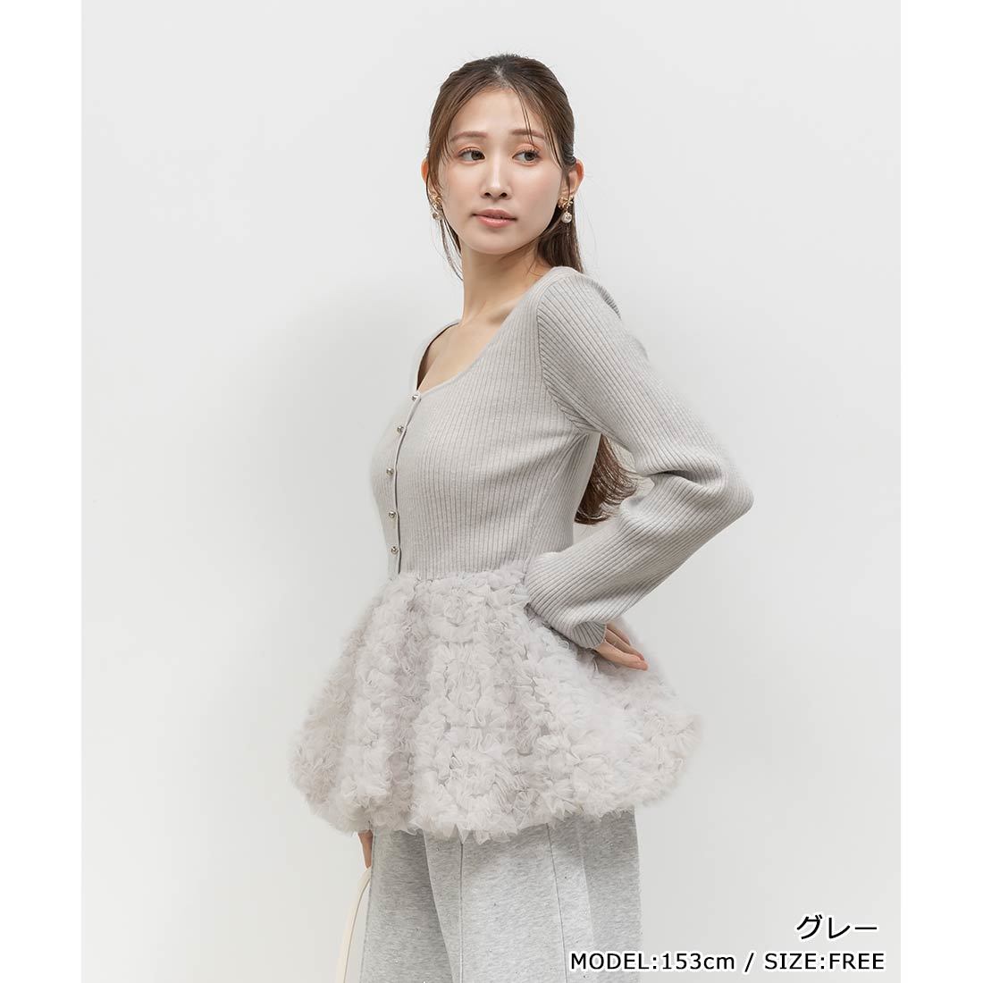 レース切替ペプラムニット ホワイト 長袖 チュール