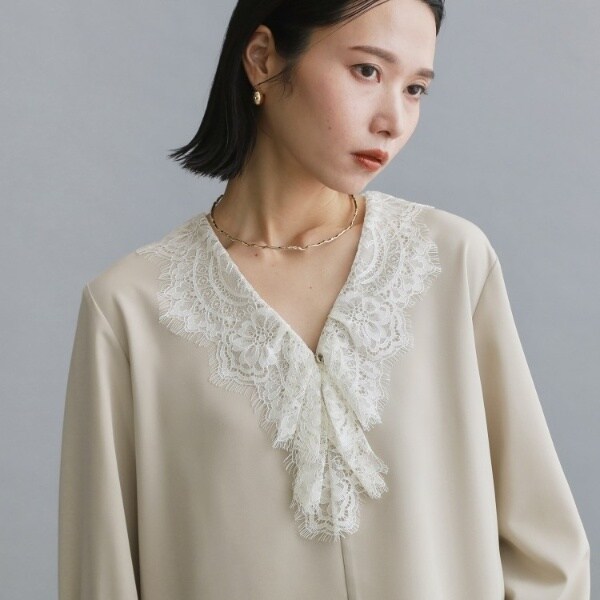 ・シャープなVネックがデコルテラインをきれいに見せ、繊細なヒゲレースが華やかさを引き立てる上品なブラウス。