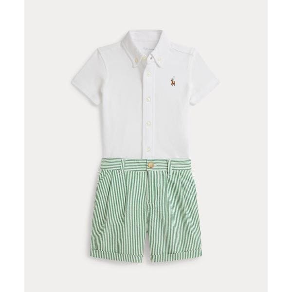 オックスフォードのルックにポロシャツのコットンメッシュ素材の快適さと動きやすさを組み合わせたボタンダウンと、シアサッカーで仕立てたショートパンツのコットン製のセット。・シャツ:左胸にマルチカラーのシグネチャーのポニー刺繍 / ボタンダウンカラー / ボタン付き前立て / 半袖 / ボックスプリーツのバックヨーク・ショートパンツ:ベルトループ / ウエスト背面に伸縮素材 / 3~6カ月サイズはフライなし / 9~24カ月サイズはジップフライ / フロント中央にボタン留め / サイドシームポケット / 背面右にボタン付きポケット / フロントにプリーツ / ロールカフス・生地や布張りの室内装飾品に色移りすることがあります※注意:柄の配置は、商品によって異なります。 【素材】・上 本体:綿 100% 装飾部分を除く パンツ 本体:綿 100%【生産国】カンボジア